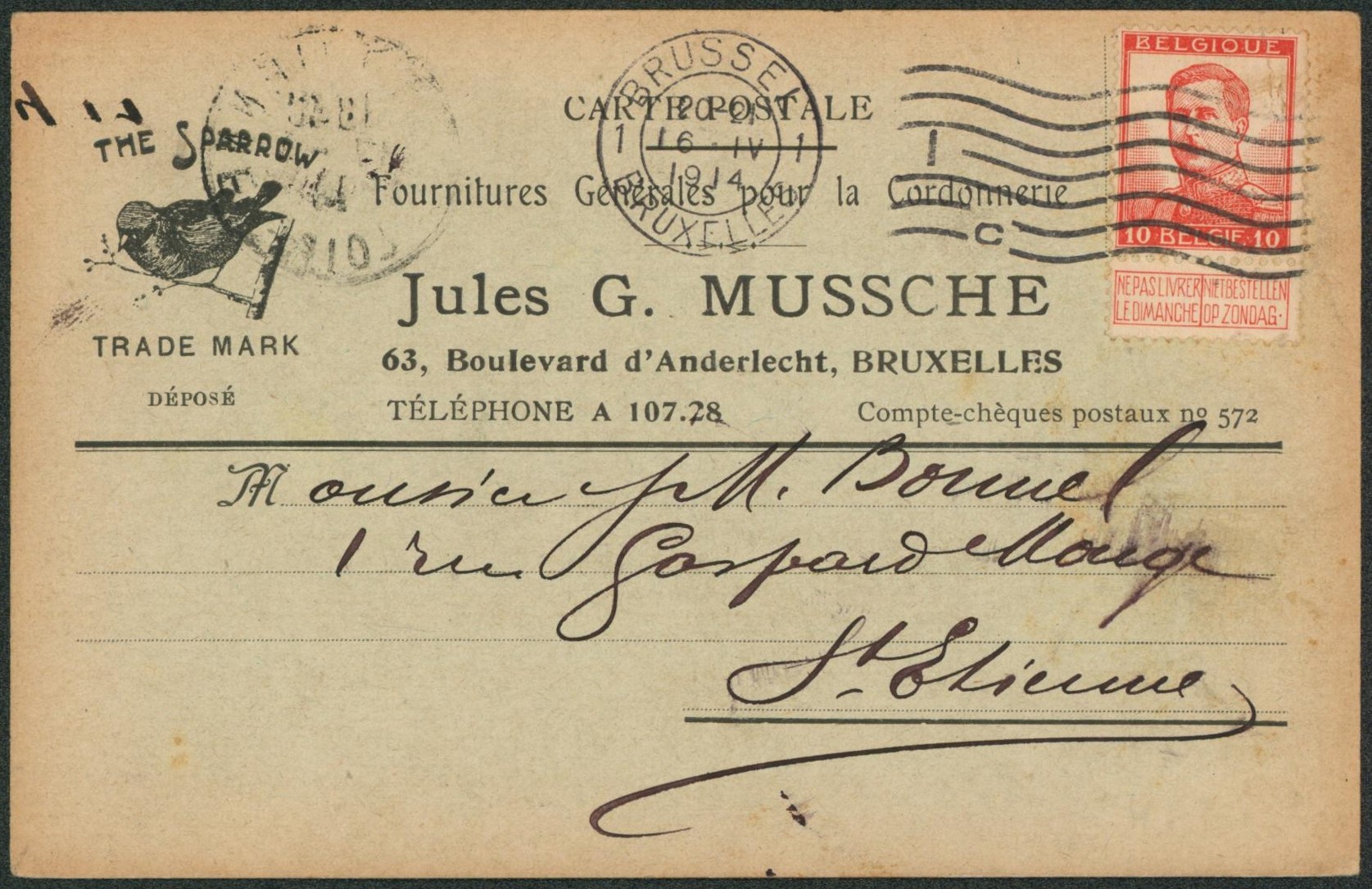 Pellens - 10C sur CP imprimé "The sparrow, fournitures générales de cordonneries" de Bruxelles > St-Etienne"