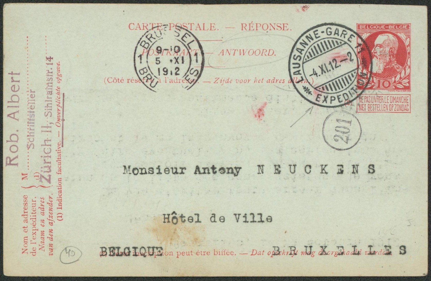 EP au type 10ctm rouge grosse barbe (réponse) de Lausanne-Gare 11 (Suisse) > Bruxelles.