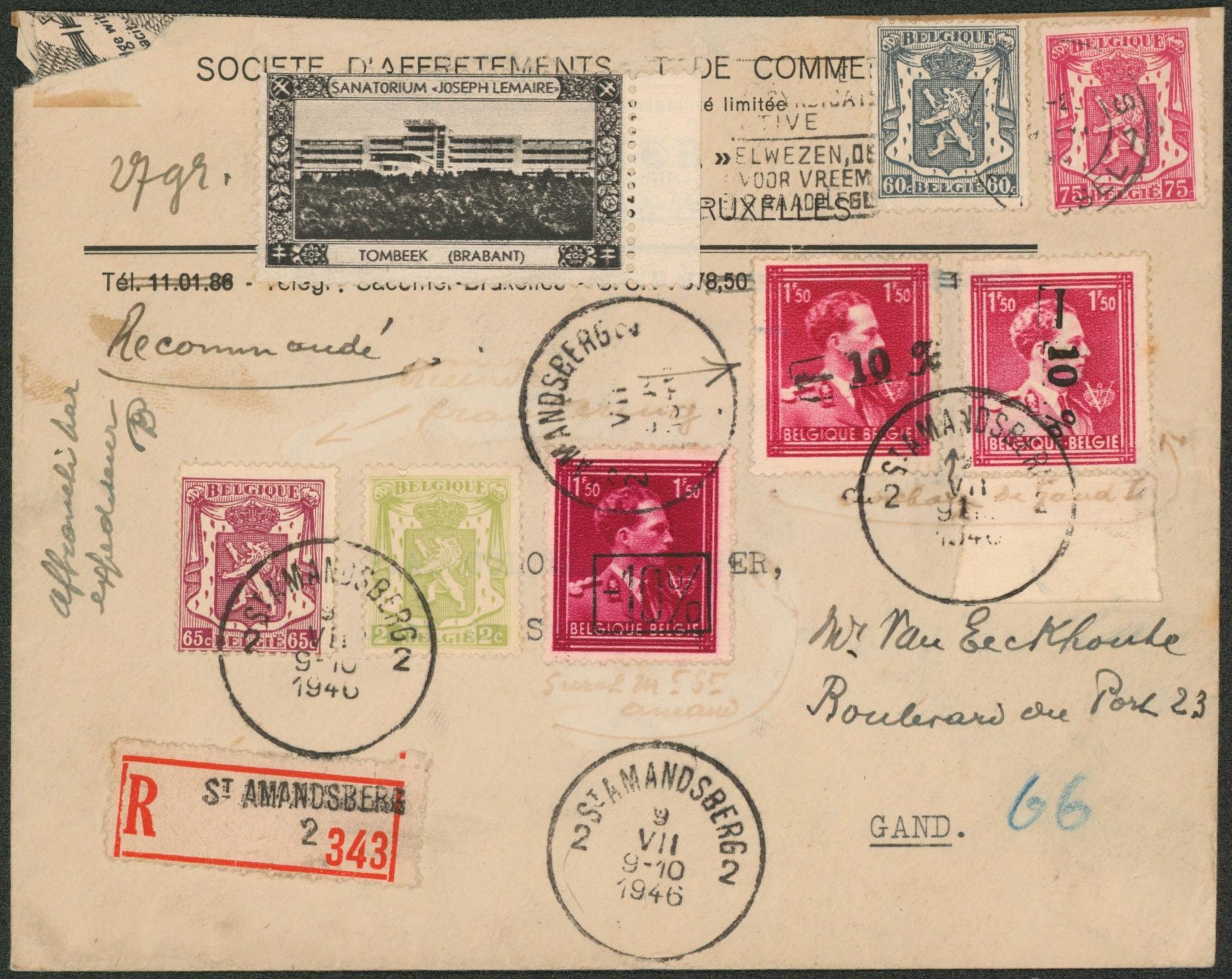 Affranch. Mixte (petit sceau, col ouvert -10%) sur lettre en recommandé de St-Amansberg > Gand