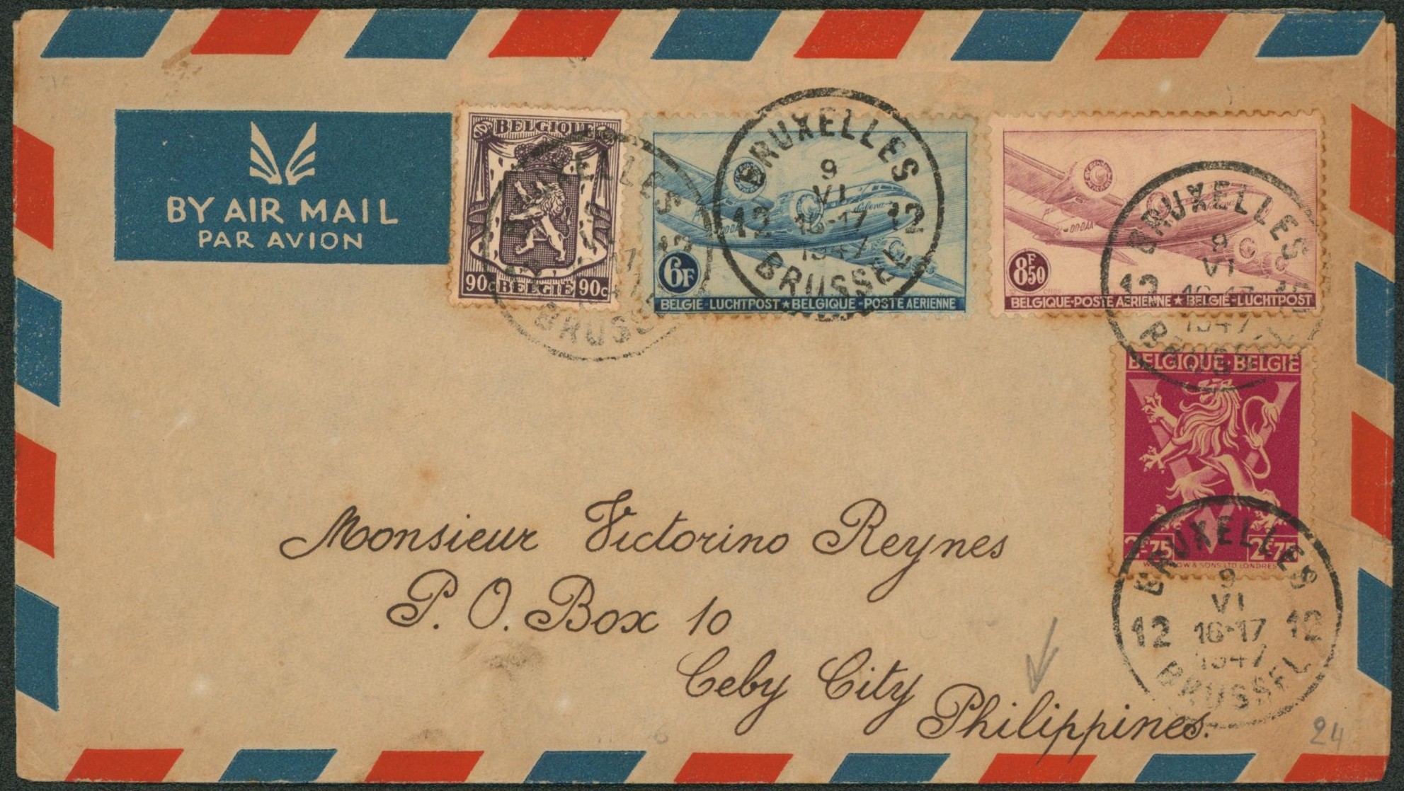 Affranch. Mixte dont PA8 et 9 sur lettre par avion de Bruxelles / Brussel 12 > Philippines çàd Cebu City + vignette au verso (Léopold Ier)
