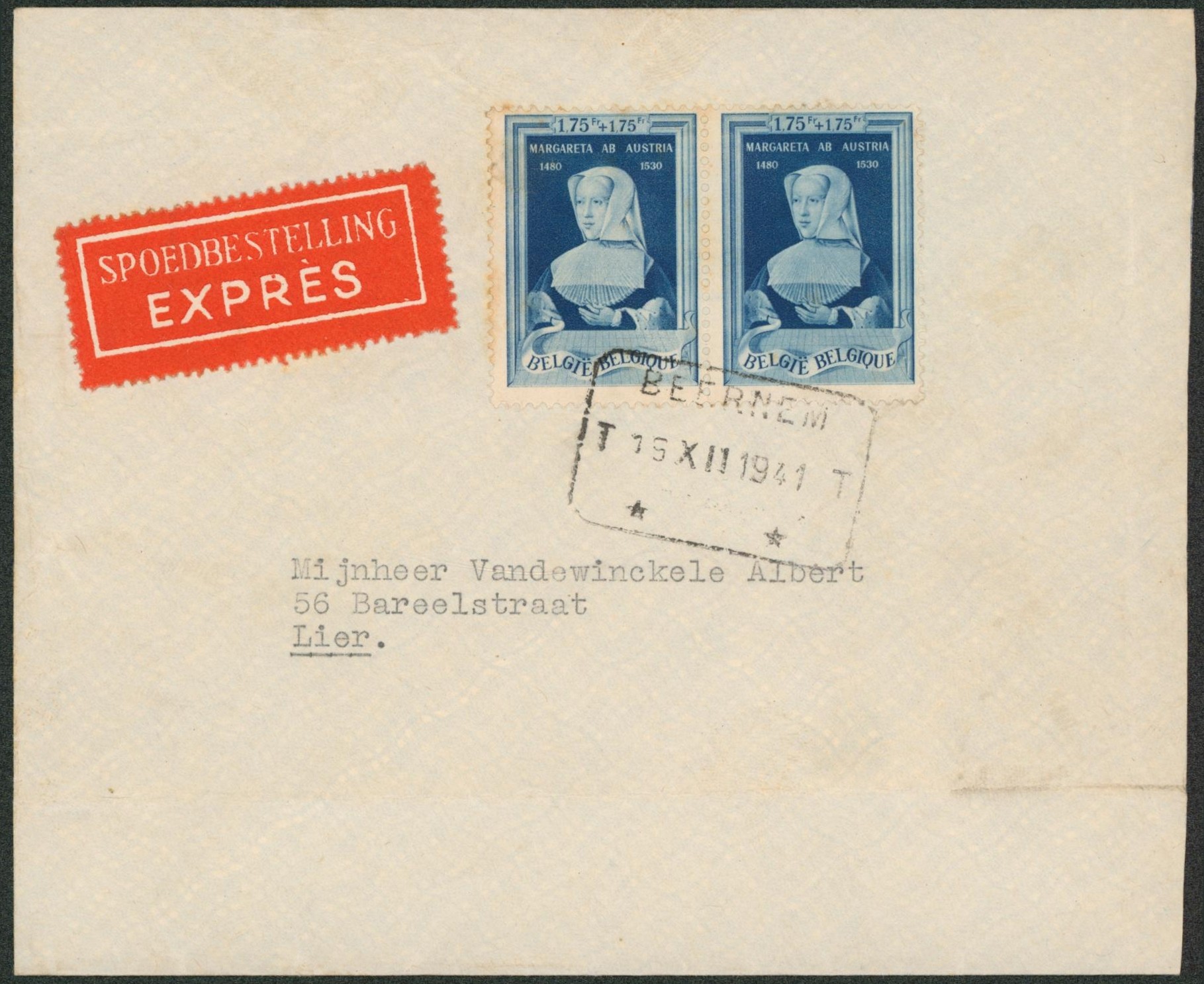 Service sociale - n°579 en paire sur lettre en expres obl télégraphe-téléphone "Berneem" > Lier. "