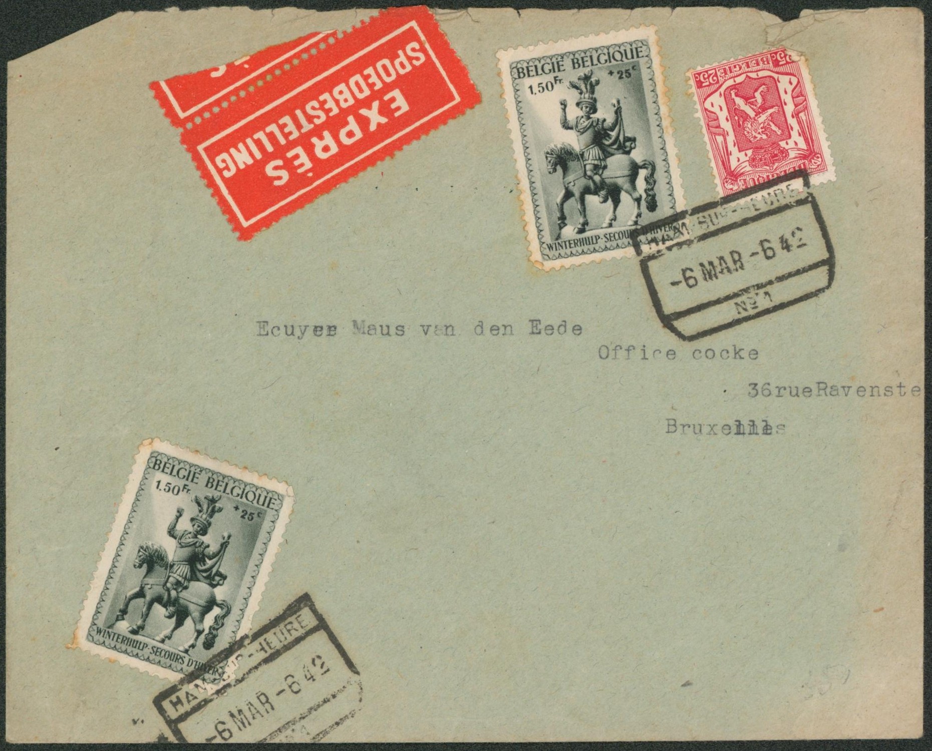 Secours d'hiver / Petit sceau sur lettre en expres obl chemin de fer "Ham sur heure / n°1" > Bruxelles. "