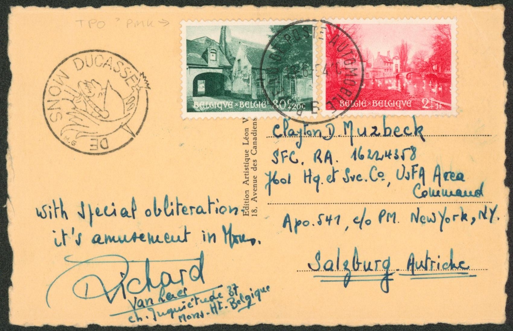 n°946/47 sur CP vue expédié de Bureau de poste automobile B + cachet temporaire "Ducasse de Mons" > Salzburg (Autriche)"