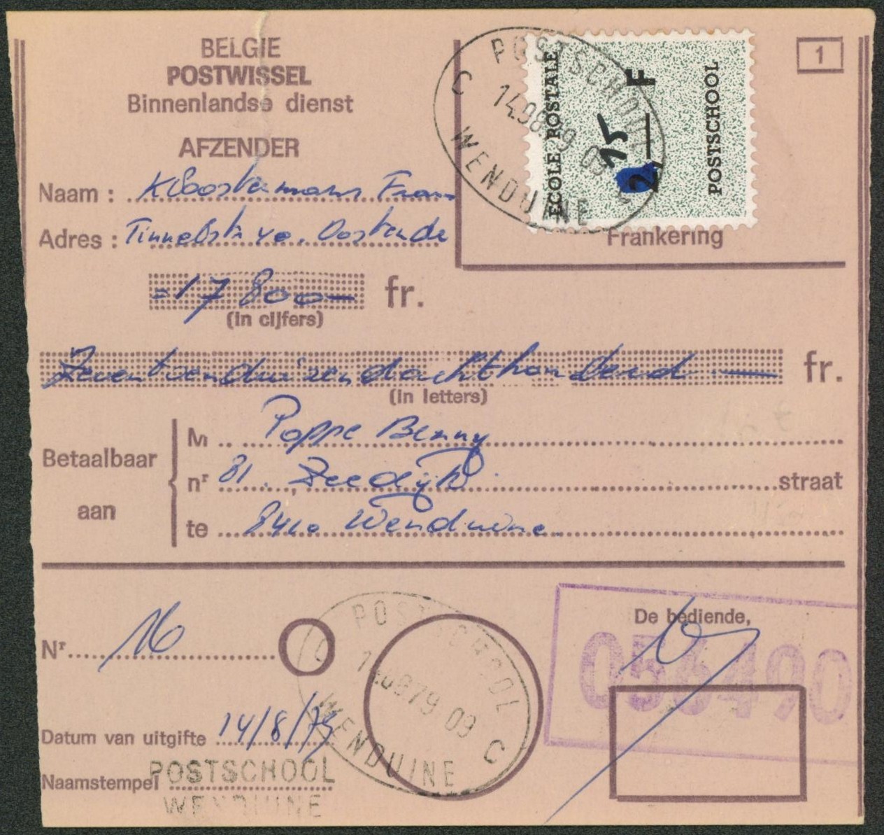 école postale (1979) - 15F sur mandat postale (17800 fr) de et vers Wenduine.