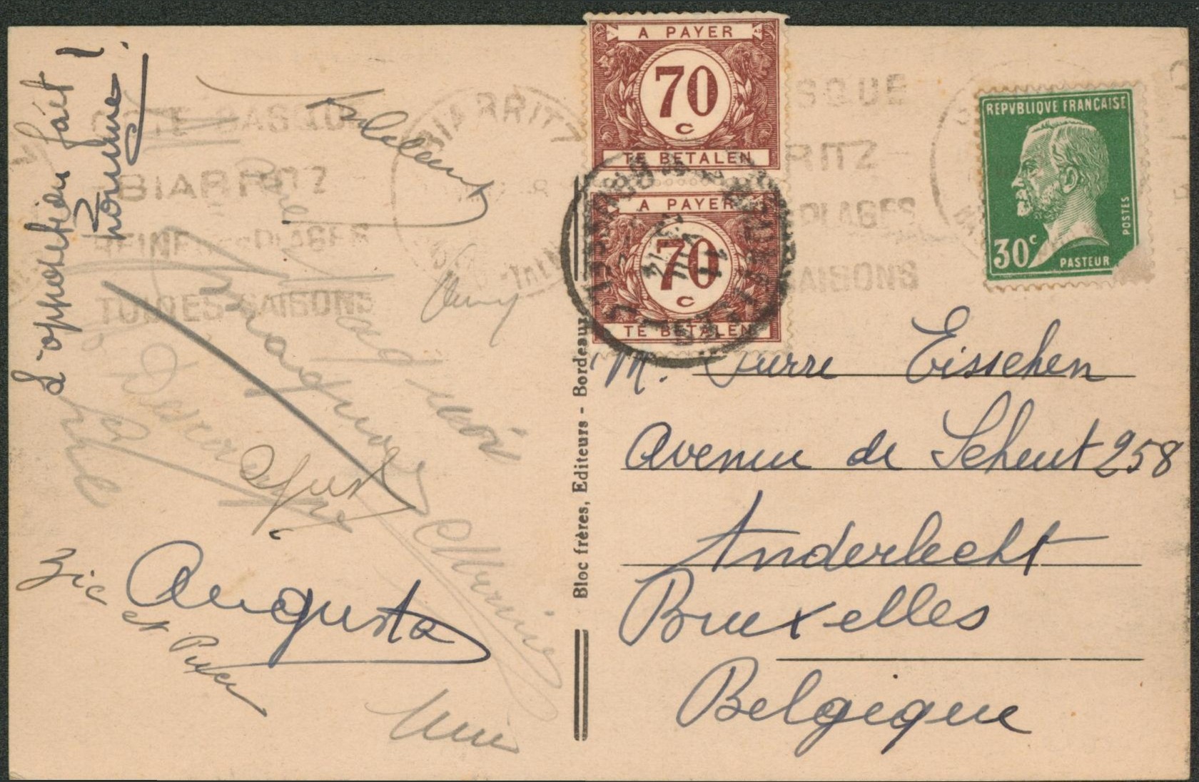 CP en provenance de France - 30Ctm de Biarritz > Bruxelles, taxé à 1F40 par TX41 en paire.
