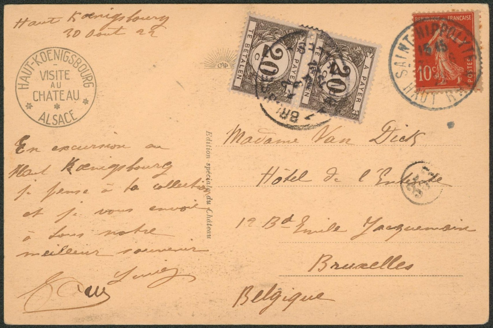 Semeuse - 10C sur CP vue expédié d'Alsace > Bruxelles, taxé à 40ctm par TX34 en paire.