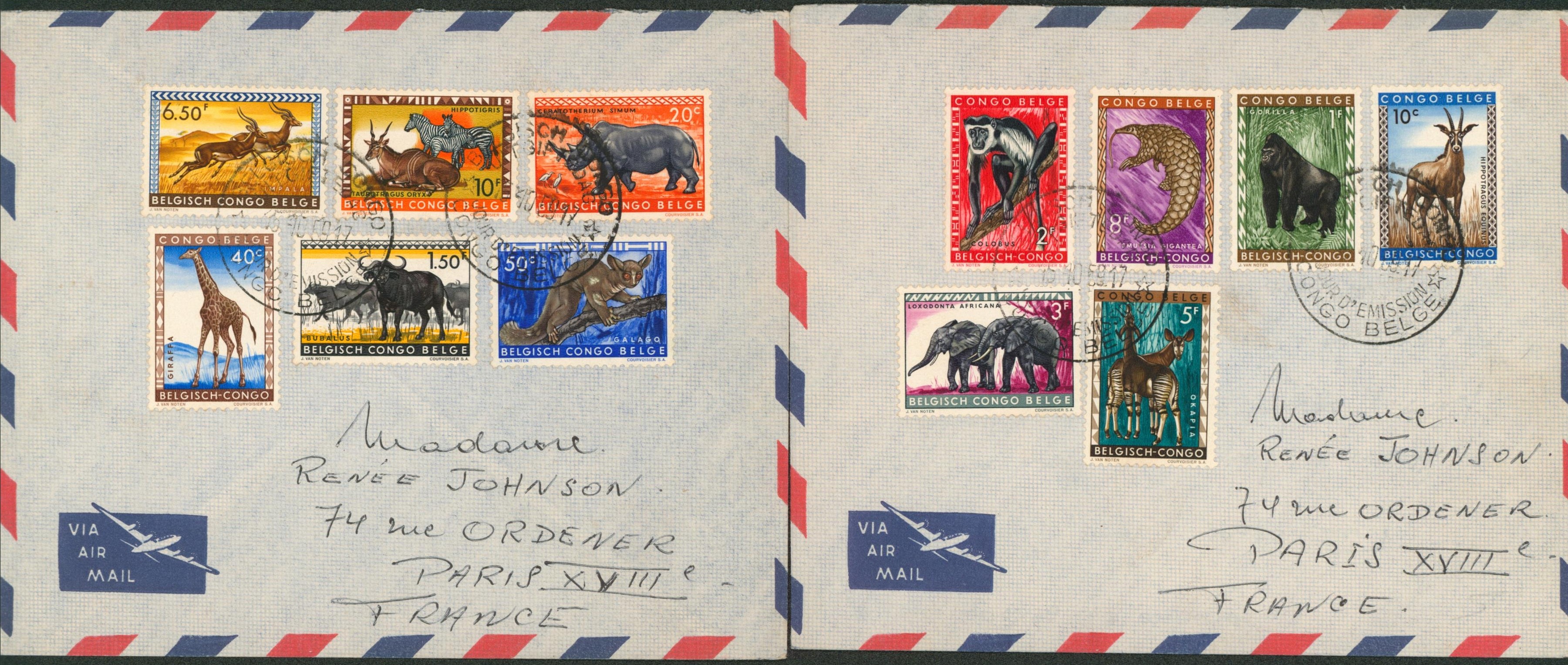 Congo Belge - Ensemble de 2 lettres avec séries complèts "animaux protégés" n°350/61 type FDC (premier jour d'émission) par avion > Paris. "