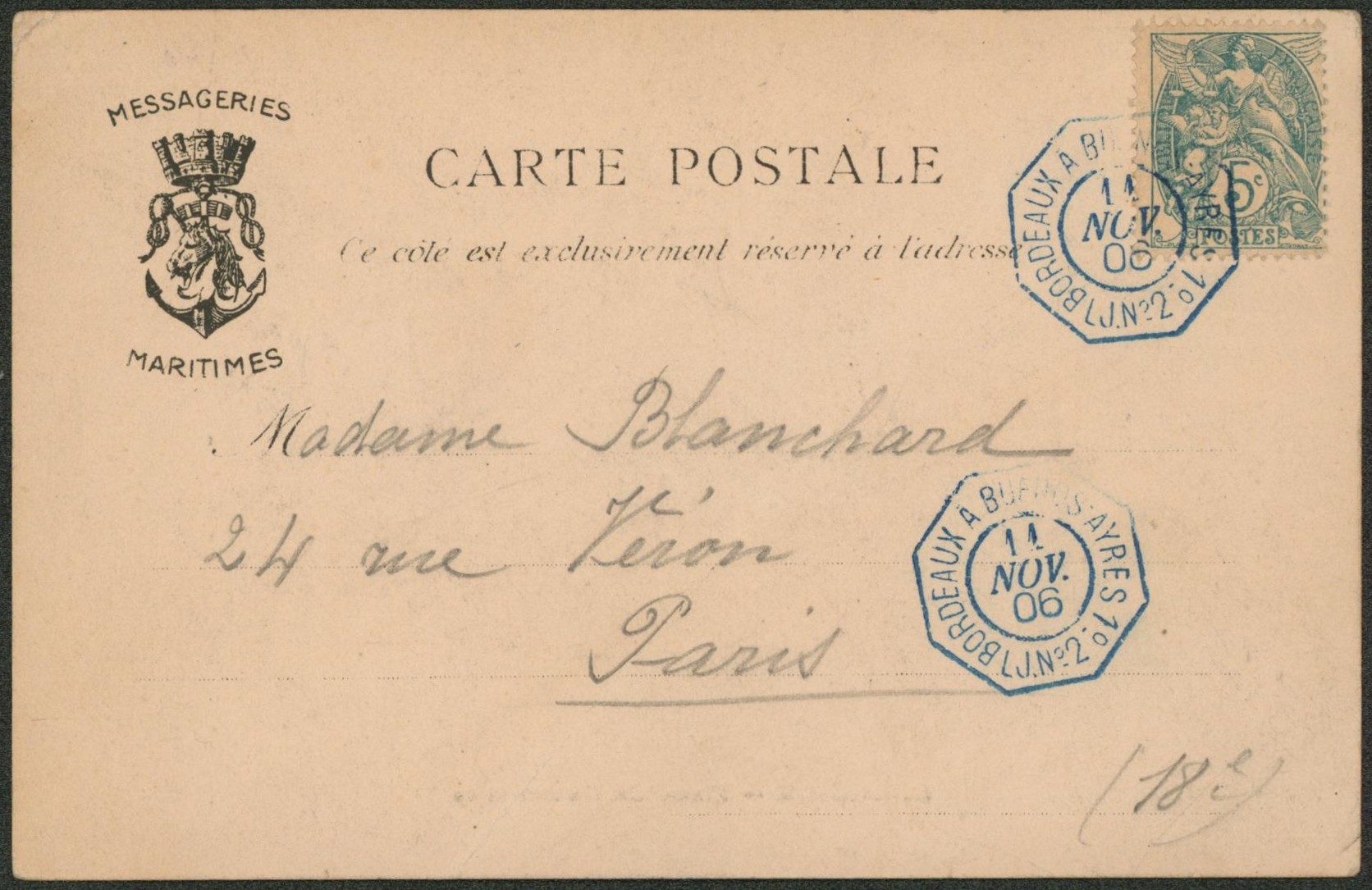 Collection (ligne maritime) - France 5ctm sur CP obl paquebot "Bordeaux à Buenos Aires / L.J. n°2" > Paris. "
