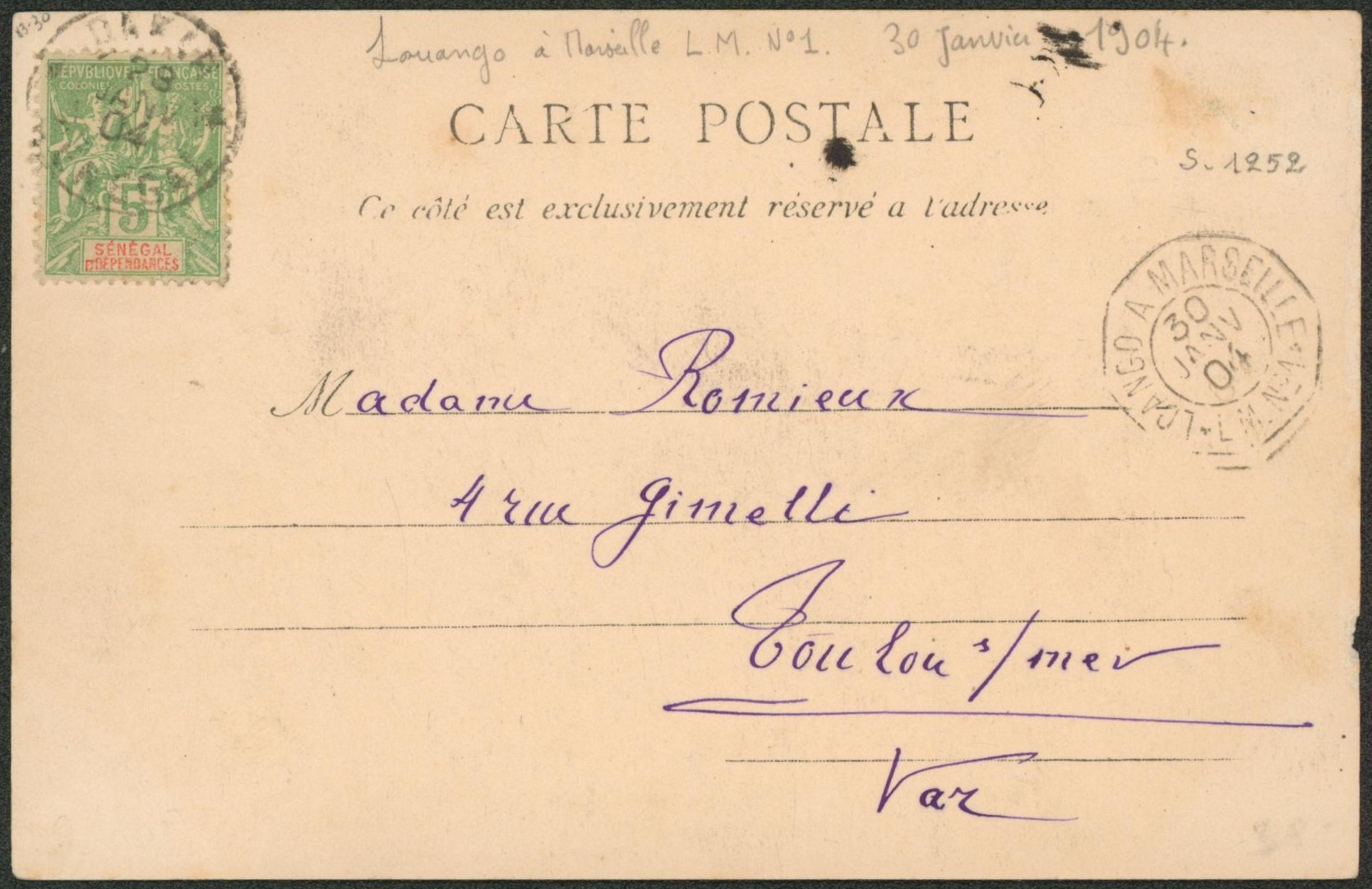 Collection (ligne maritime) - Sénégal 5C sur CP obl paquebot "Loango à Marseille / L.M. n°1" > Toulon-S-Mer. "