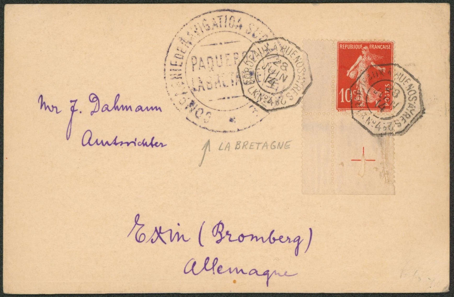 Collection (ligne maritime) - France 10ctm semeuse coin de feuille sur Lettre obl paquebot "Bordeaux à Buenos-Ayres 2 / L.K. n°4" + grand cachet PAQUEBOT LA BRETAGNE > Exin (Allemagne)"