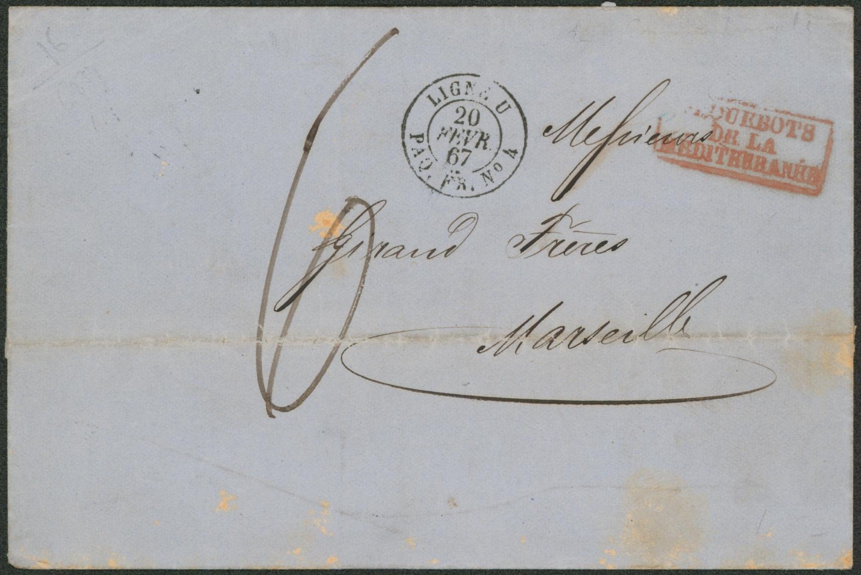 Collection (ligne maritime) - LAC datée de Constantinople + cachet paquebot "Ligne U / Paq. FR. n°4" et encadré rouge "paquebot de la méditéranée", port 6 > Marseille. "