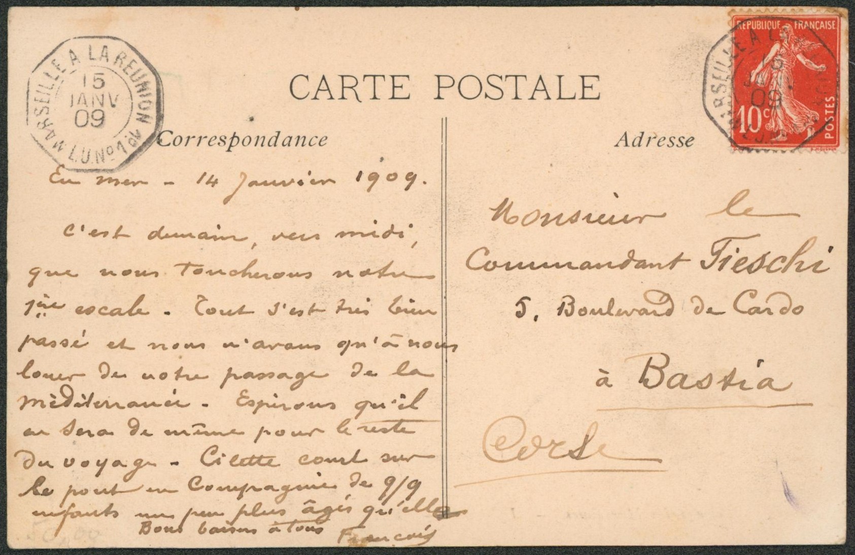 Collection (ligne maritime) - France 10ctm semeuse sur CP obl paquebot "Marseille à la réunion 1 / L.U. n°1" > Bastia (Corse)"