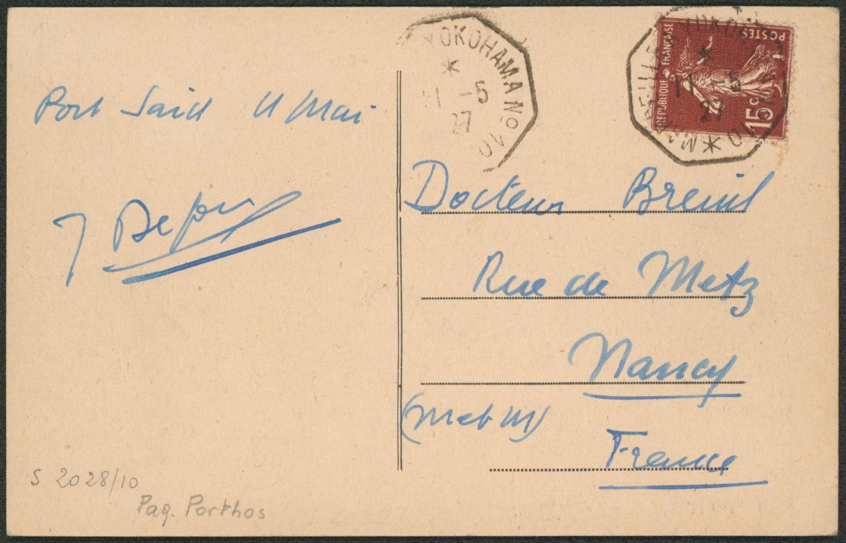 Collection (ligne maritime) - France Semeuse 15ctm sur CP obl paquebot "Marseille à Yokohama n°10" > Nancy"