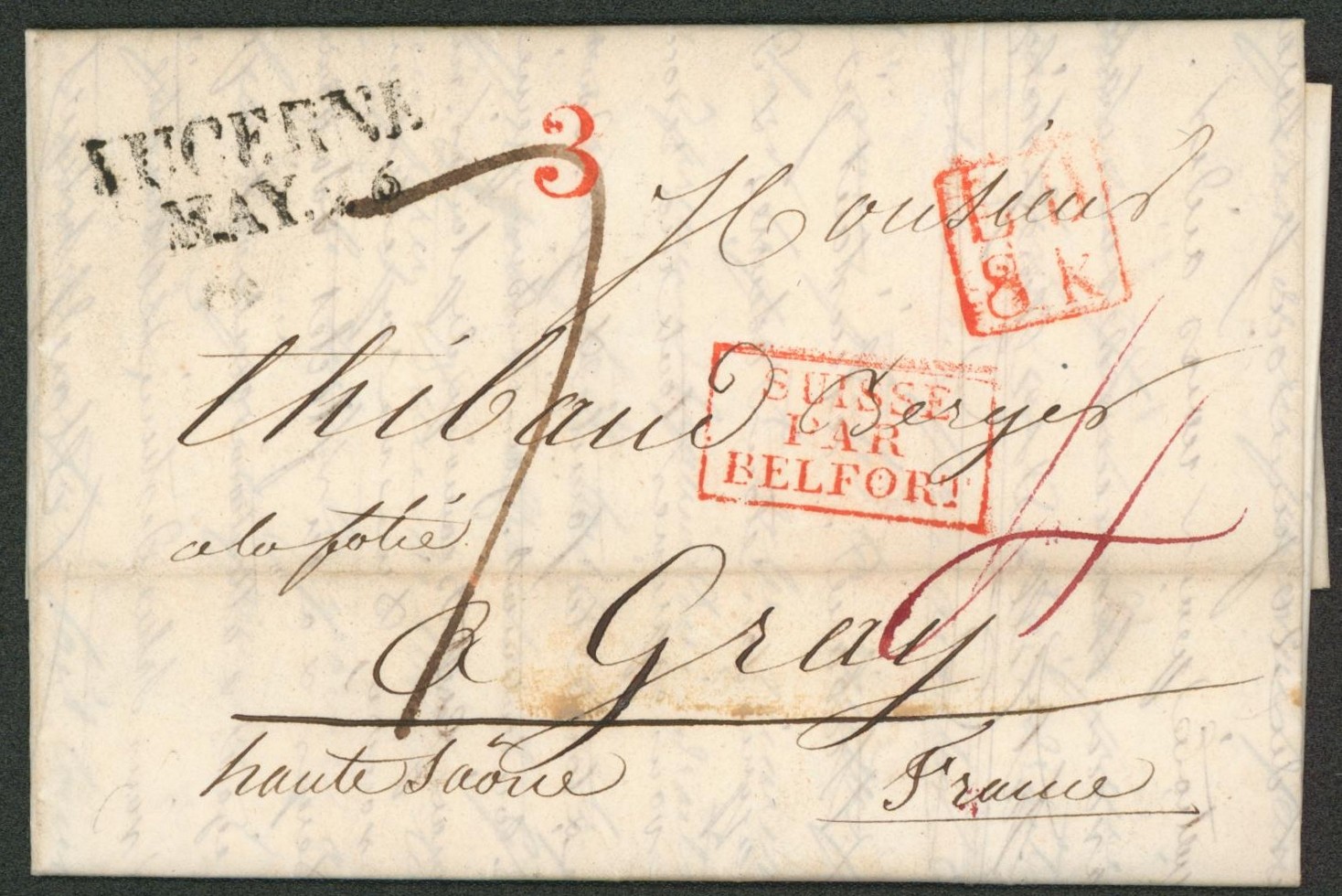 LAC datée de Lucerne + obl linéaire noir LUCERNE MAY 34 + encadré rouge "Suisse par Belfort" > Haute savoie (France). "