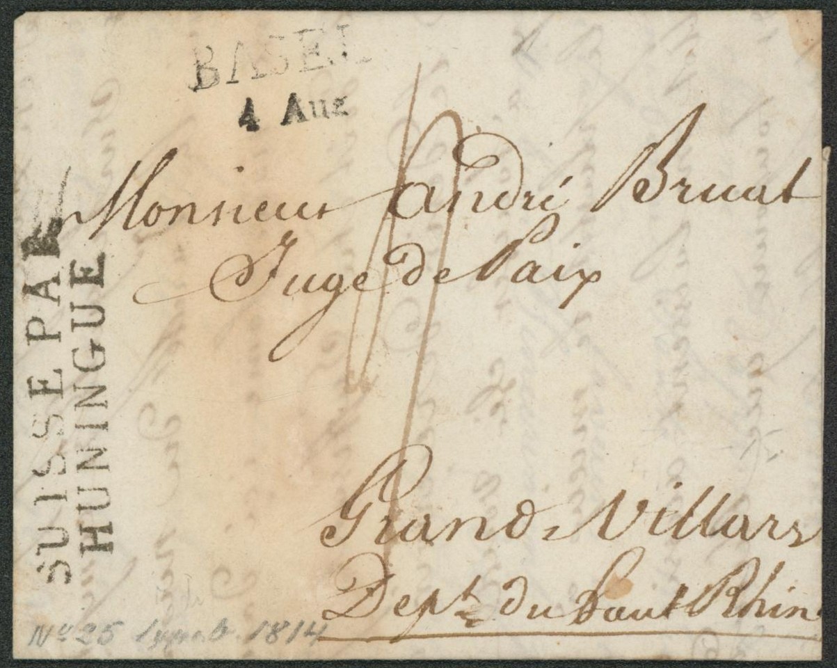 Suisse - LAC datée de Basel + obl linéaire noir Basel 4 aug. Et griffe de passage SUISSE PAR / HUNINGUE, port "4" > Grandvillars (France)"