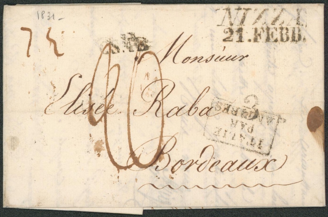 Collection (ligne maritime) - LAC datée de Nice + obl linéaire noir NIZZA 21 FEBB, port "20" > Bordeaux + encadré noir "Italie / Par / Antibes". "