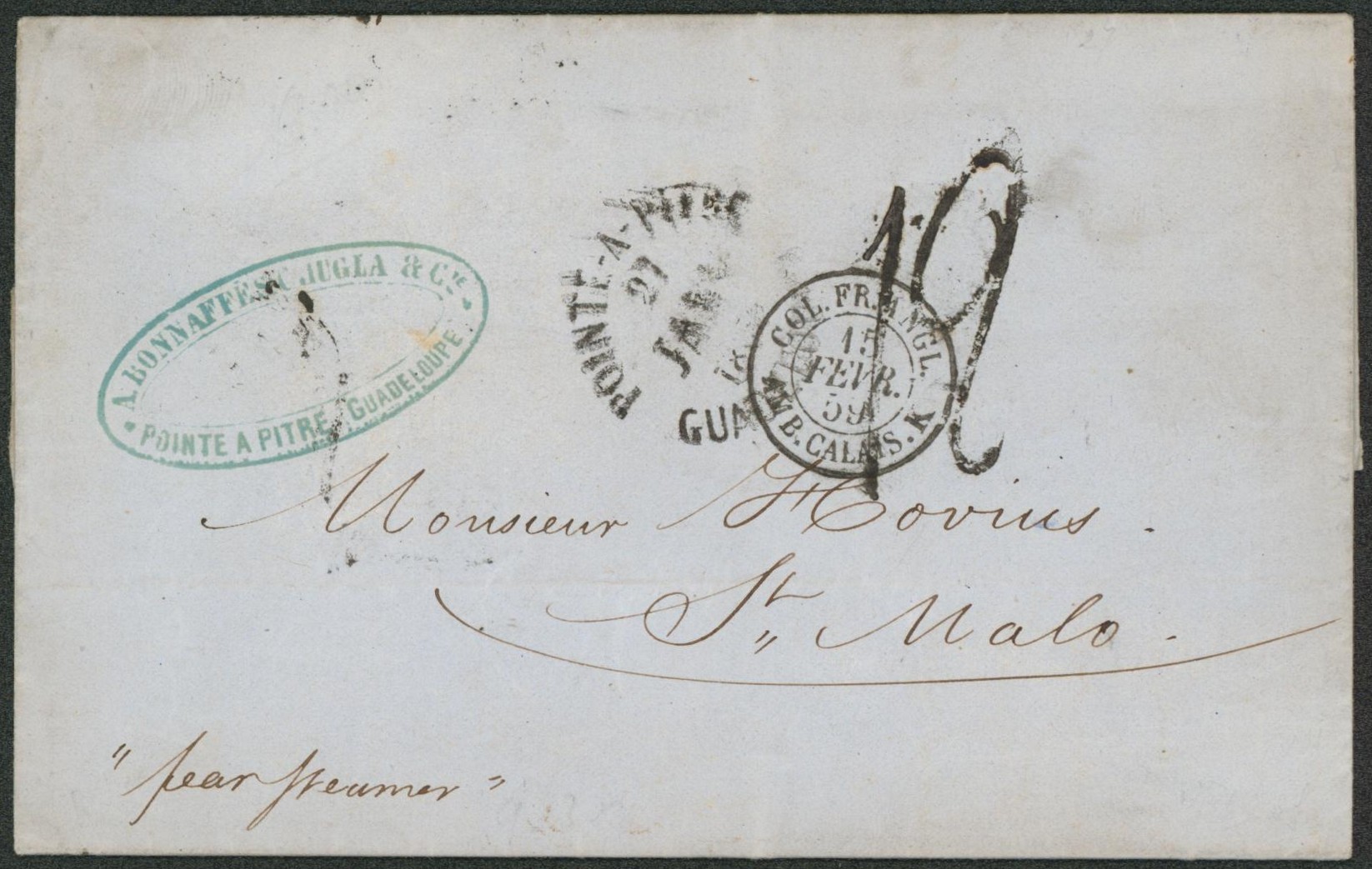 Collection (ligne maritime) - LAC datée de Pointe-à-pitre (Guadeloupe), cachet tampon "12" + passage "Col. Fr. Angl. / Amb. Calais. K" > St-Malo par steamer. "