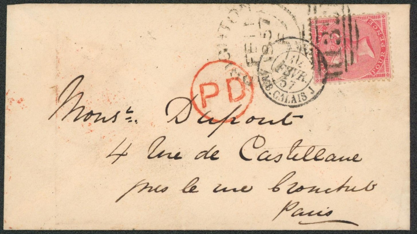 Collection (ligne maritime) - Grande-Bretagne : Yv n°18 sur env. de Brighton + cachet rouge "PD" > Paris + passage "Angl. / Amb. Calais. J" Salles 1182/J"