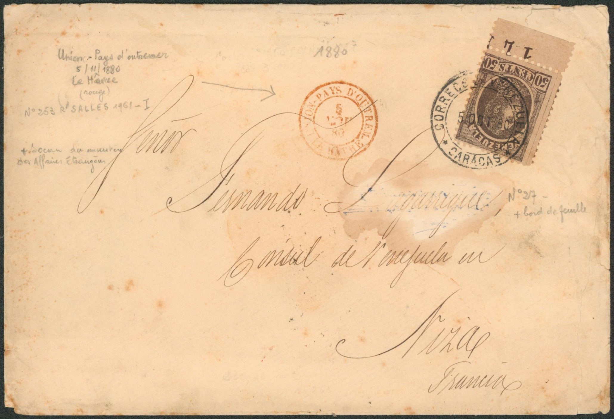 Vénézuela - Yv n°27 + BDF sur lettre expédiée de Caracas + cachet de passage rouge "Union - Pays d'outremer / Le havre" (Salles 253) > Niza (Nice, France). TB et rare. "