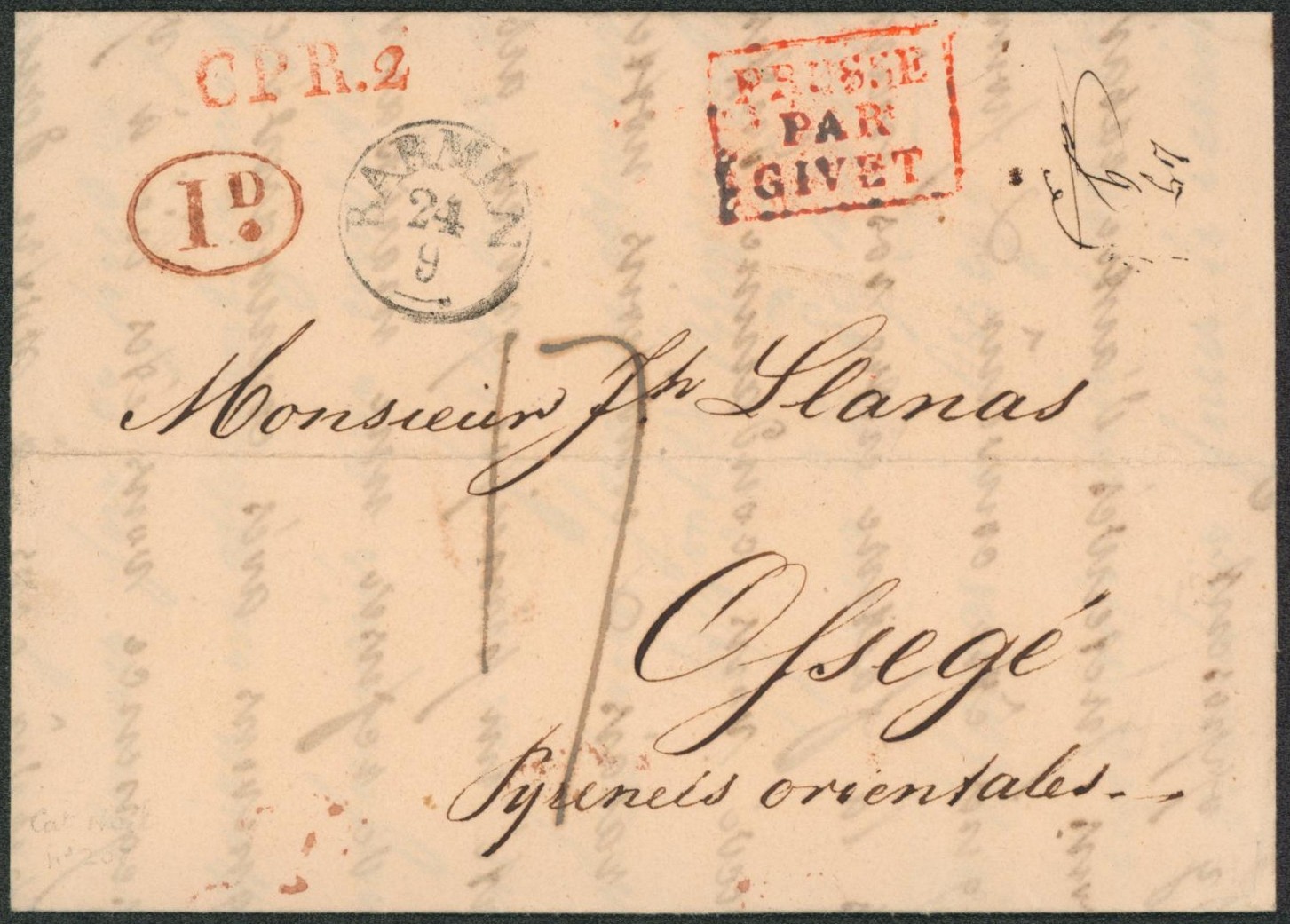 Allemagne - LAC datée de Barmen + cachet dateur, griffe linéair rouge CPR.2 et passage çàd encadré rouge "Prusse par Givet" > Pyrenées orientales (A déterminer, France). "