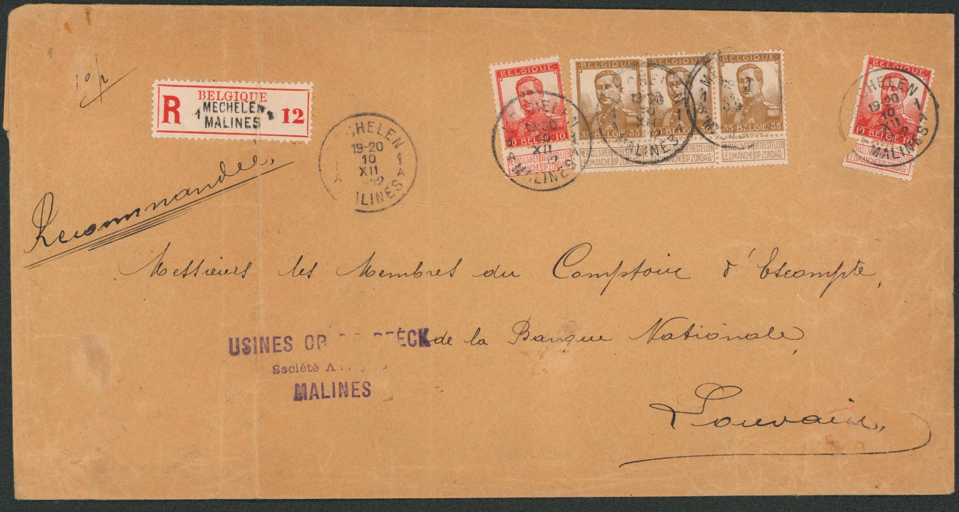 Pellens - n°111 x2 (un tp touché) + n°113 en bande de 3 sur grande enveloppe en recommandé de Malines > Louvain.