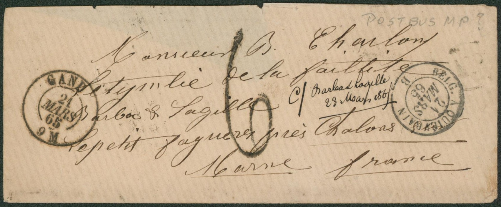 Enveloppe non affranchie + cachet dateur "Gand" port 6 décimes, boite rurale peu lisible > Près de Chalon (France)"