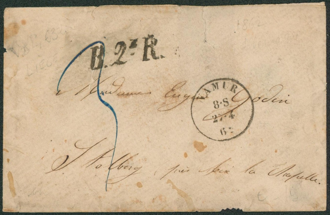 Enveloppe non affranchie + cachet dateur "Namur", griffe 2e rayon B2R, port "3" > Stolberg (Allemagne) via Aachen"