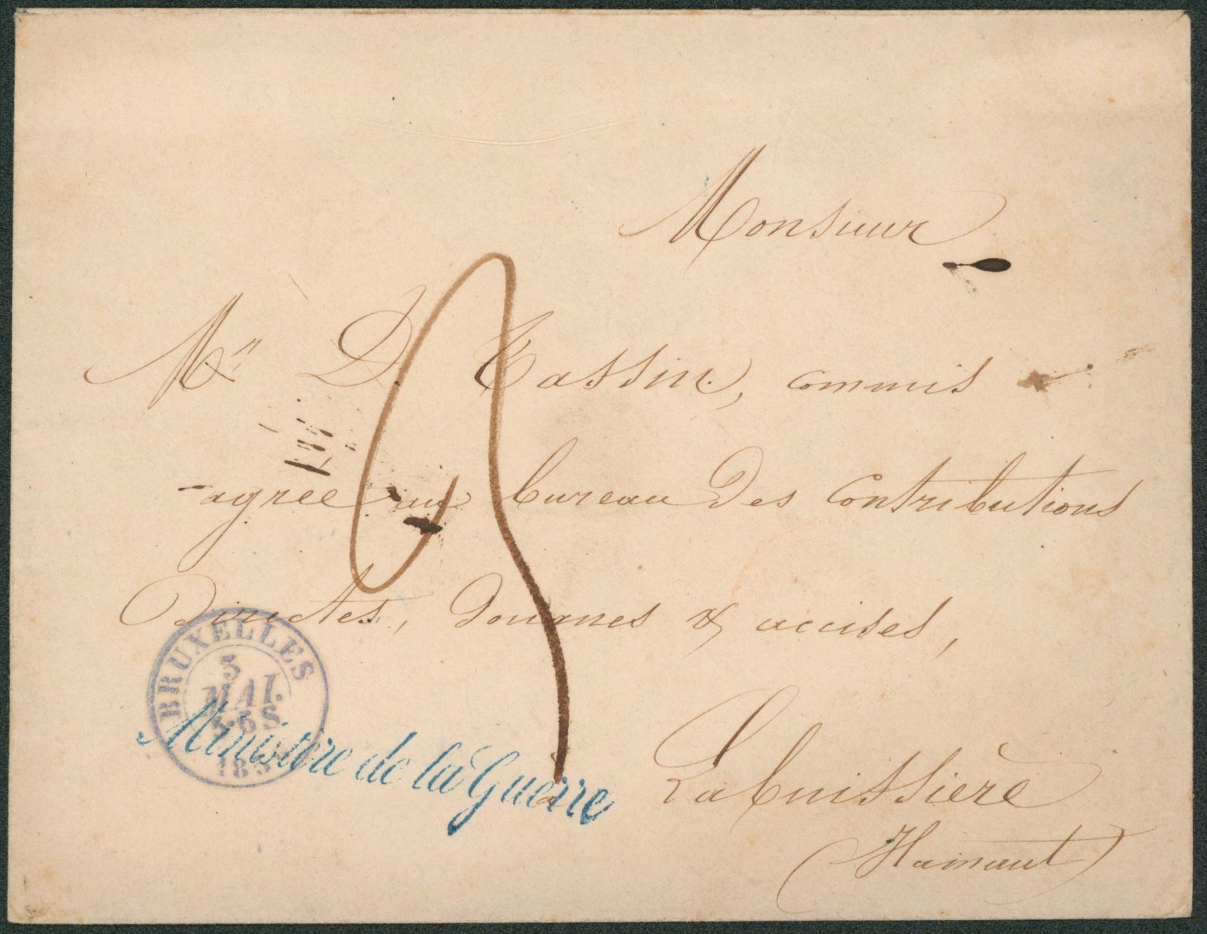 Enveloppe non affranchie du Ministère de la guerre çàd cachet dateur Bruxelles 3/05, port 3 décimes > Labuissière