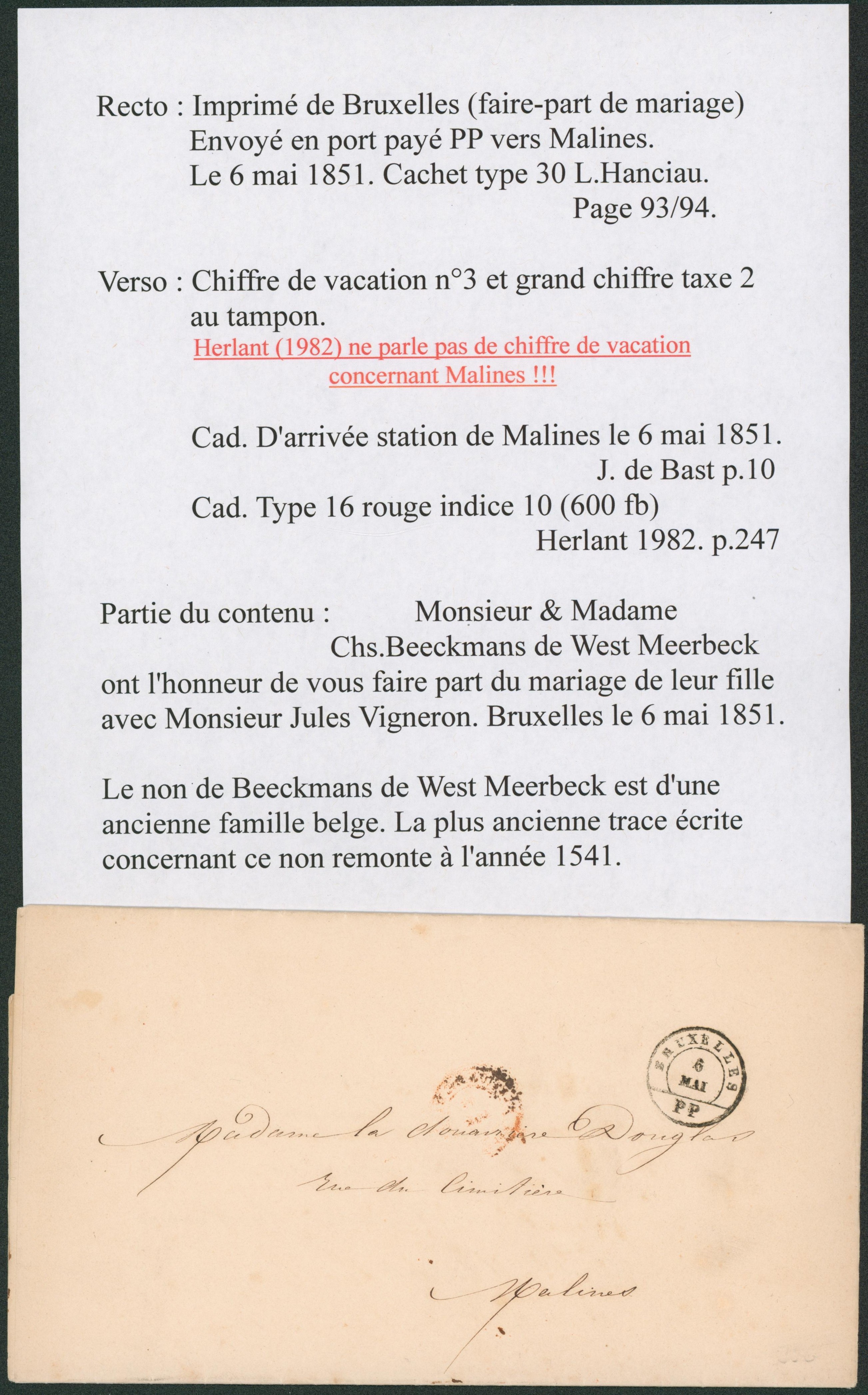 Page de collection - Imprimé de Bruxelles (faire-part de mariage) + cachet imprimé > Malines. Verso cachet de vacation n°3, et grand chiffre taxe 2 au tampon