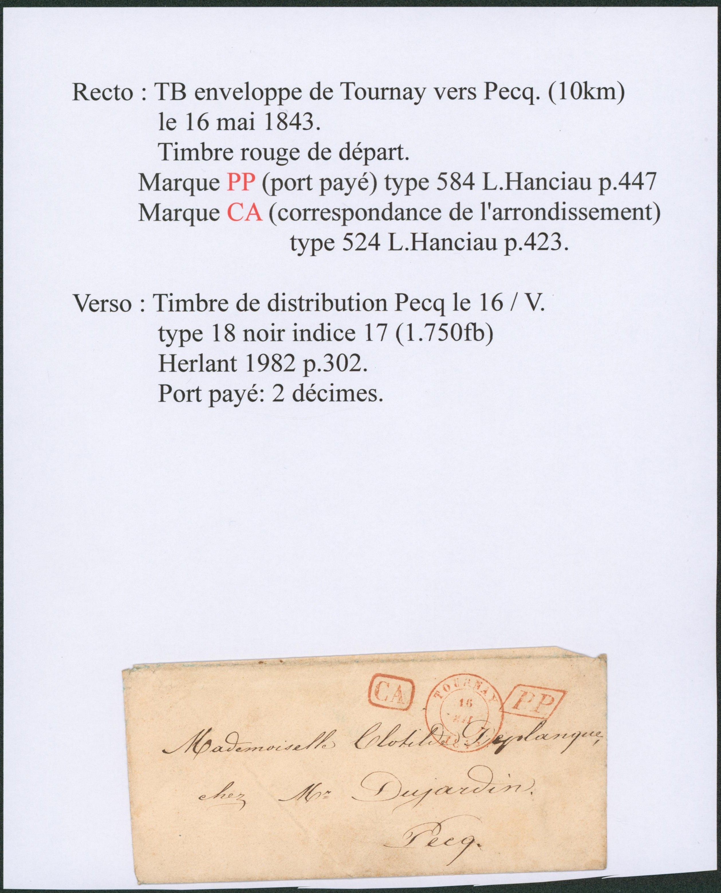 Page de collection - Enveloppe en PP de Tournay + timbre CA > Pecq. Verso cachet T18 "Pecq" + taxation 2 décimes."