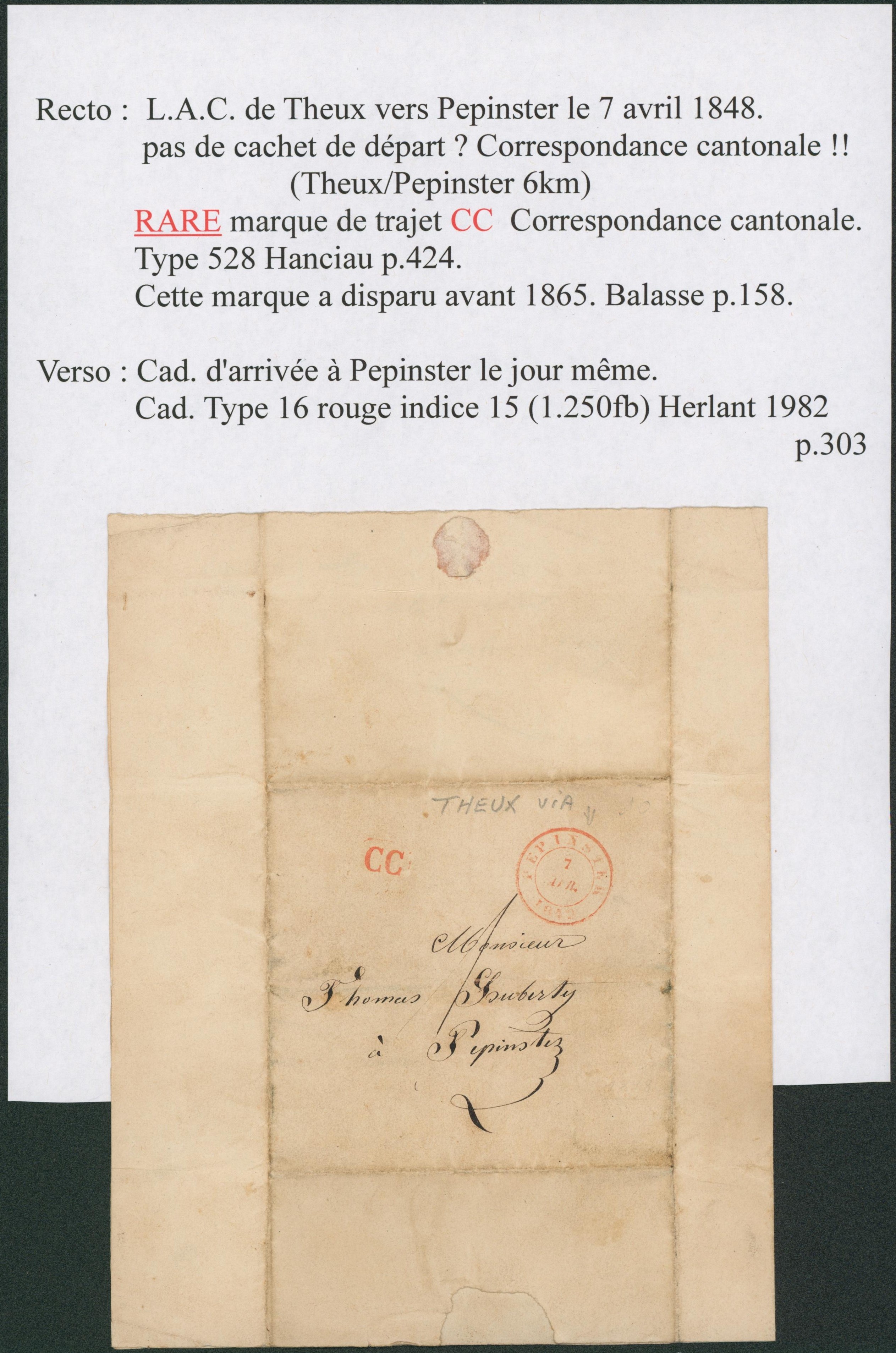 Page de collection - LAC datée de Theux + cachet dateur "Pepinster" > Pepinster. Corespondance cantonale, marque CC en rouge."