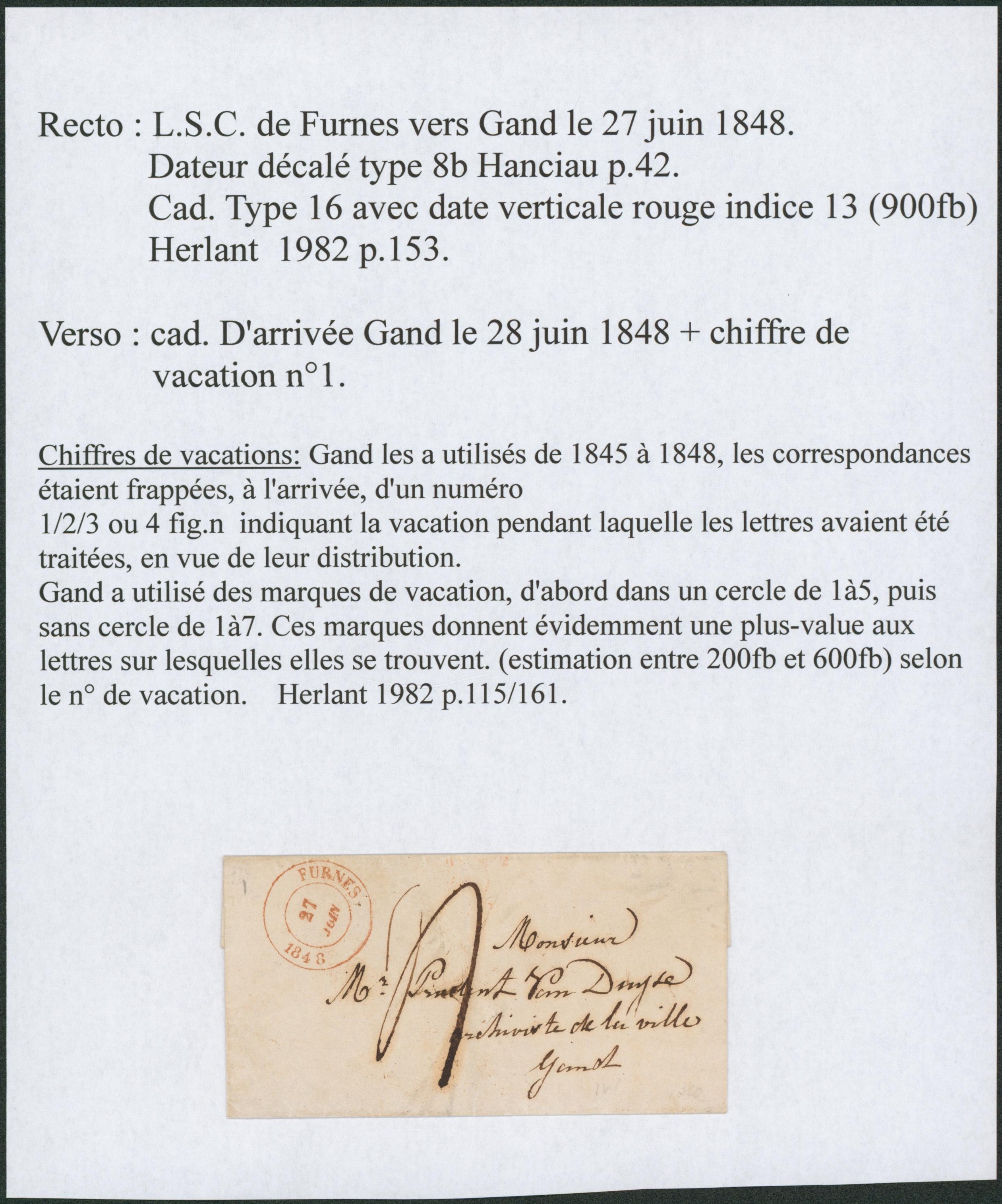 Page de collection - LSC + cachet dateur "Furnes" (27/06) port 4 décimes > Gand. Chiffre de vacation au verso "1""