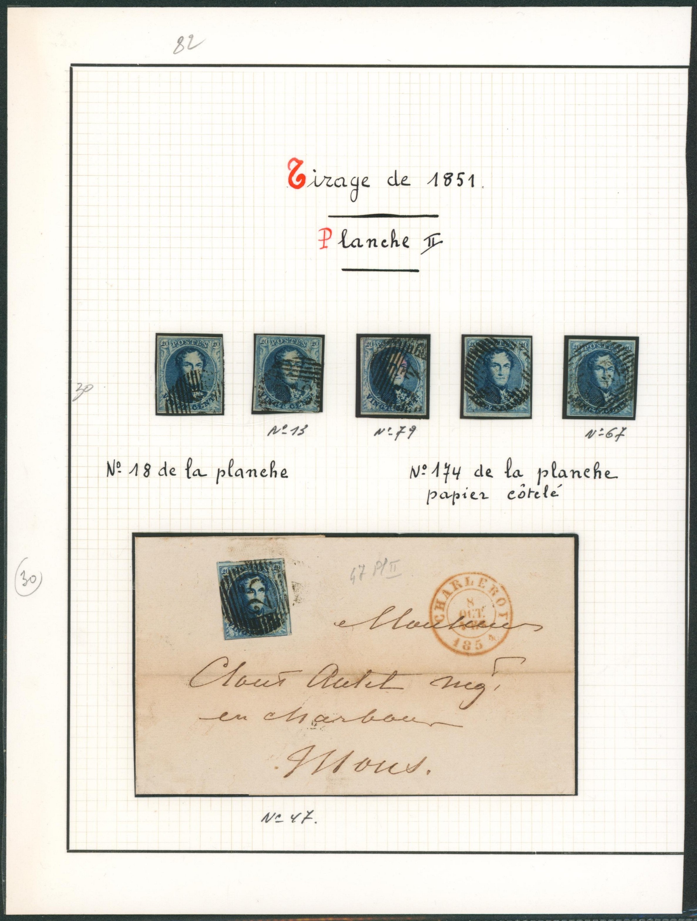 Page de collection - n°7 planche II planchage sur 5 timbres margés + une lettre