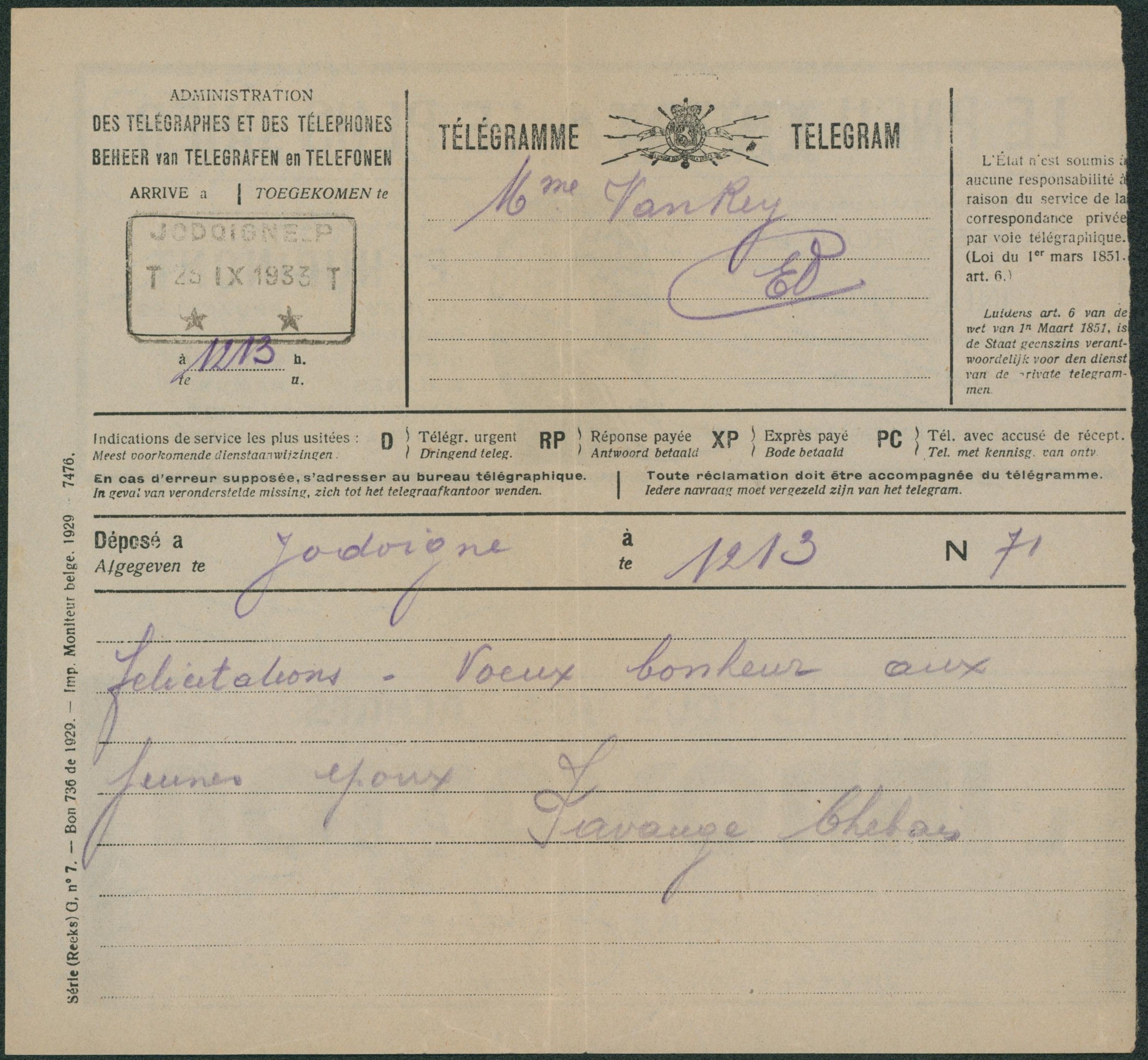 Télégramme (série G n°7) déposé à Jodoigne > Jodoigne çàd cachet télégraphe-téléphone JODOIGNE.P (2 étoiles) Verso Publicité (pneu india, innovation)