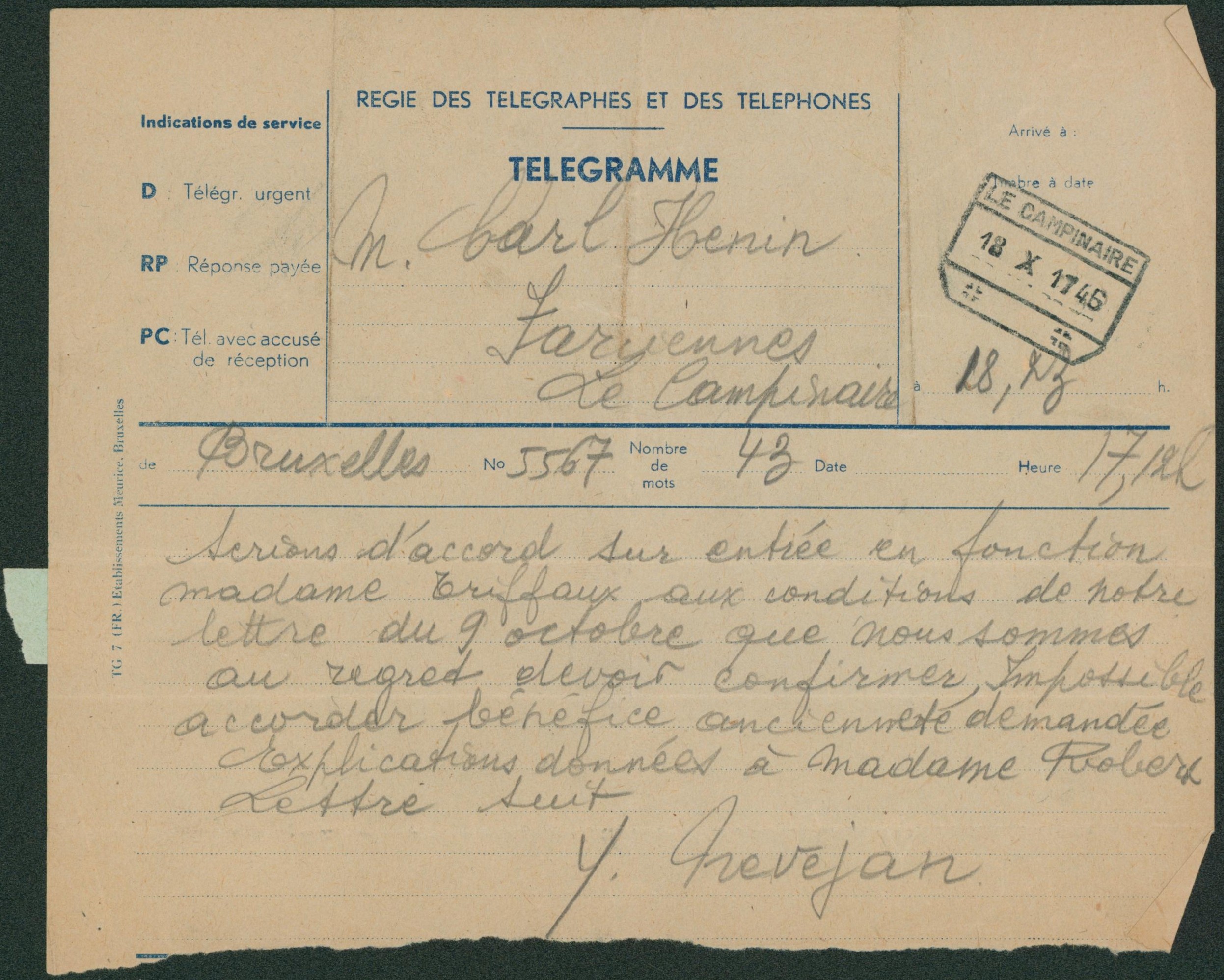 Régie des télégraphes et des téléphones - Télégramme (TG7) déposé à Bruxelles > Farcienne + cachet CDF "Le campinaire". Texte long ! "