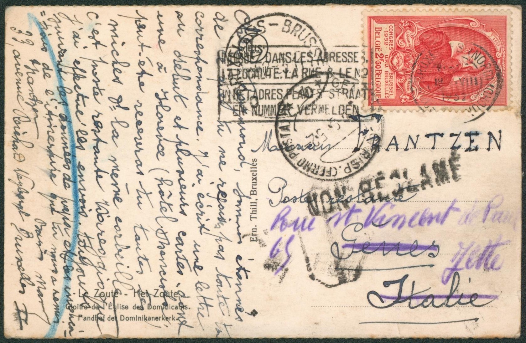 U.P.U. - n°883 sur CP vue expédiée de Bruxelles (Nord) > Gènes (Italie), non réclamé, retour à Jette au crayon.