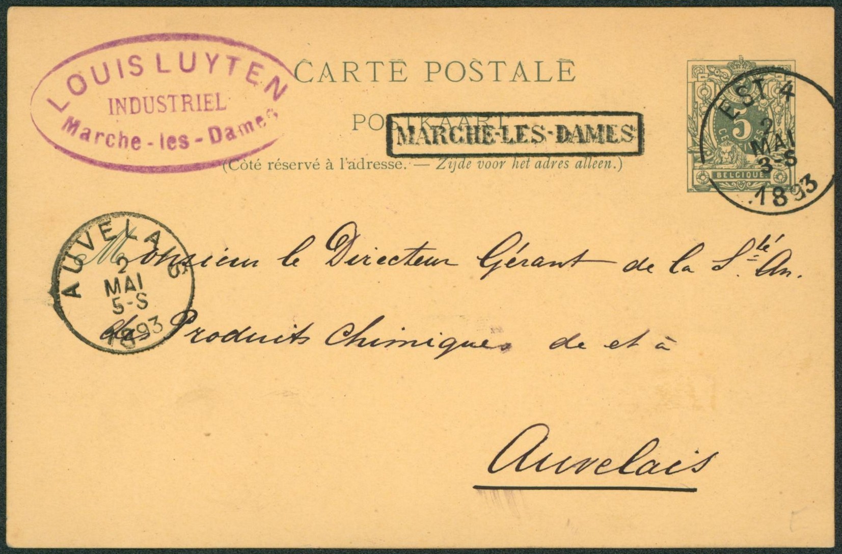 EP au type 5ctm vert obl ambulant "Est 4" + griffe encadrée MARCHE LES DAMES > Auvelais. TB "