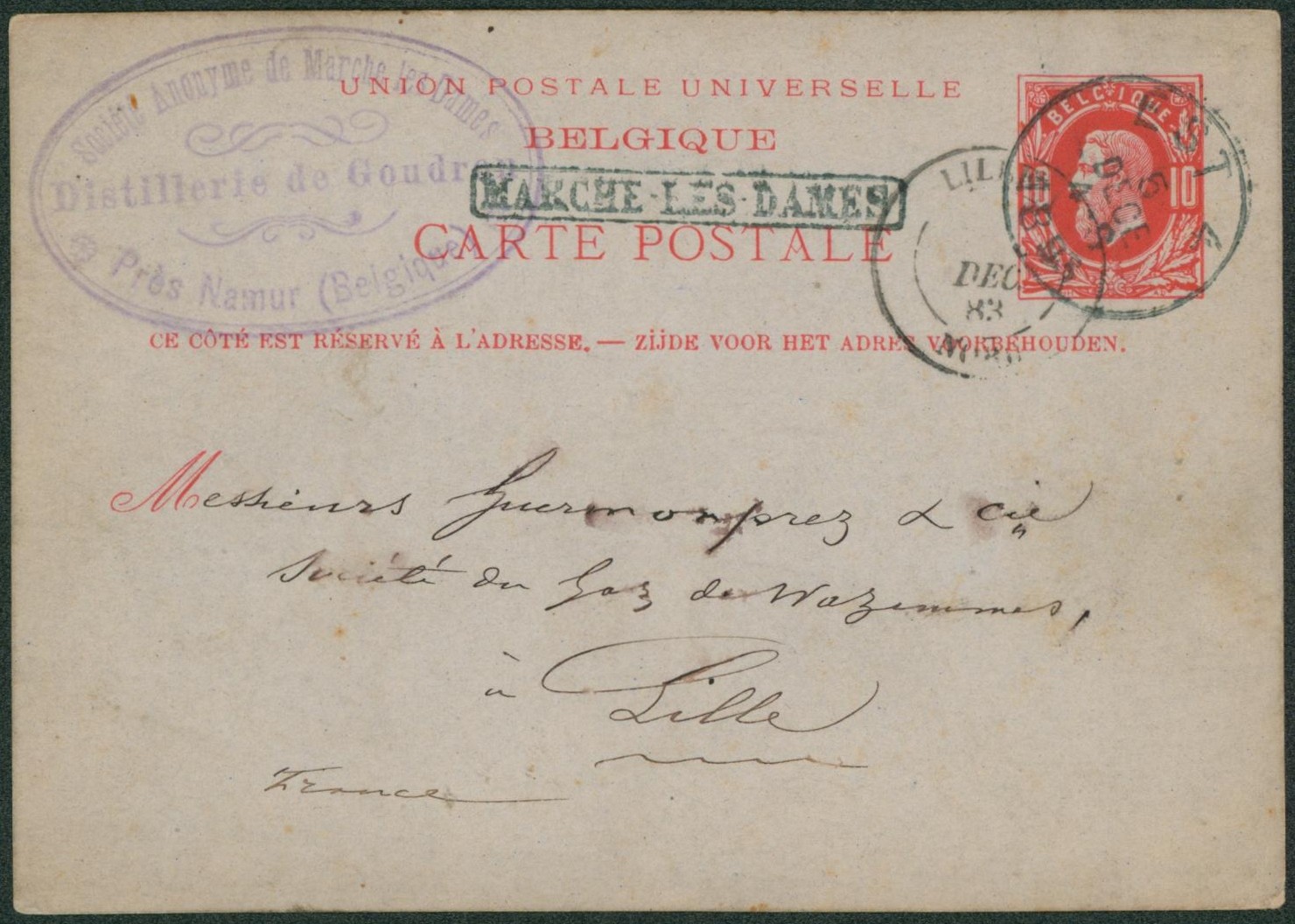 EP au type 10ctm rouge obl ambulant "Est 4" + griffe encadrée MARCHE LES DAMES > Lille / Distillerie de Goudron près de Namur"