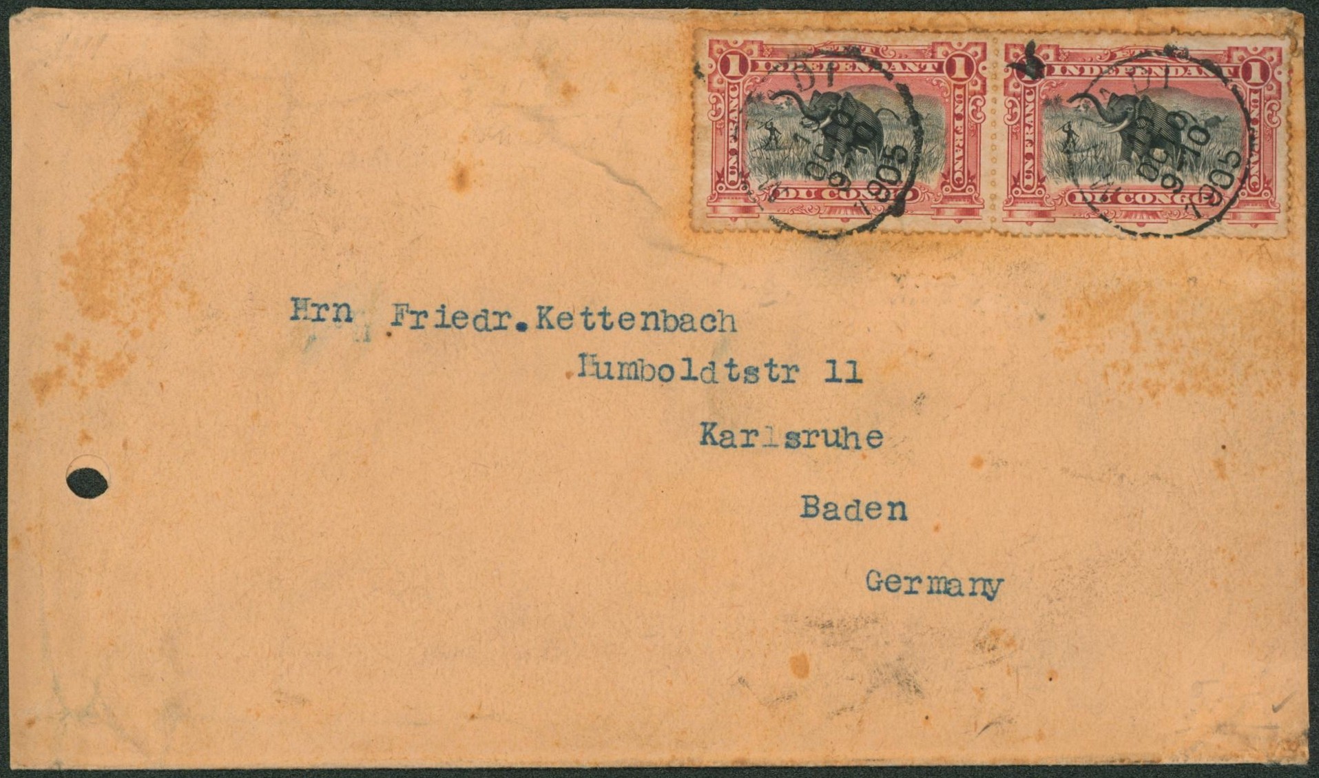 Congo Belge - n°26 en paire sur lettre (défaut, perforation) expédié de Matadi > Baden (Germany)
