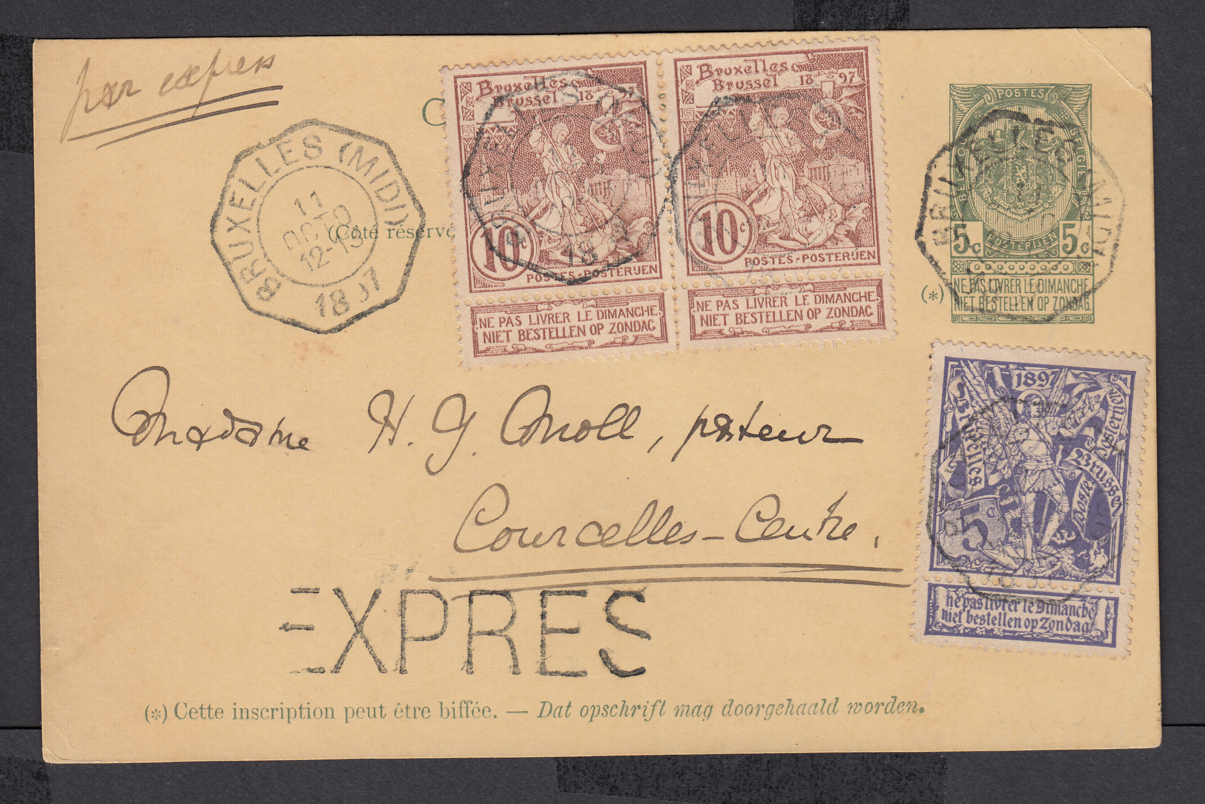 EP au type 5ctm vert + n°71 et 72 x2 en expres çàd obl télégraphique "Bruxelles (Midi)" > Courcelles-centre. TB"