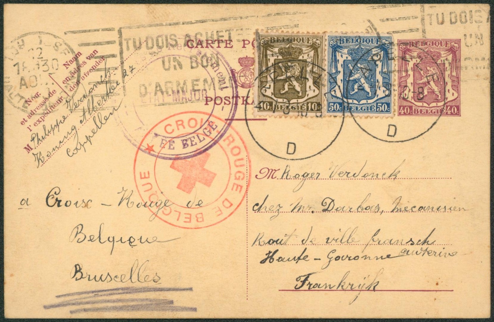 EP au type 40ctm lilas + affranch. Complémentaire petit sceau de l'état expédié de Cappellen + cachet "croix-rouge de Belgique" > France. "