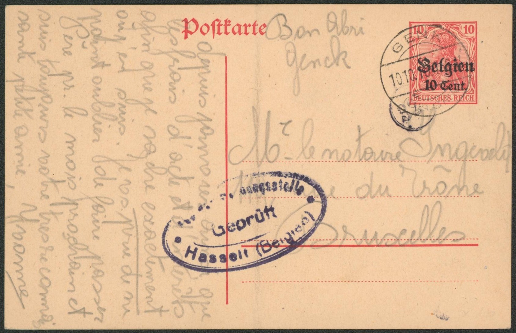 EP au type 10ctm rouge obl à pont "Genck" + censure Hasselt > Bruxelles"