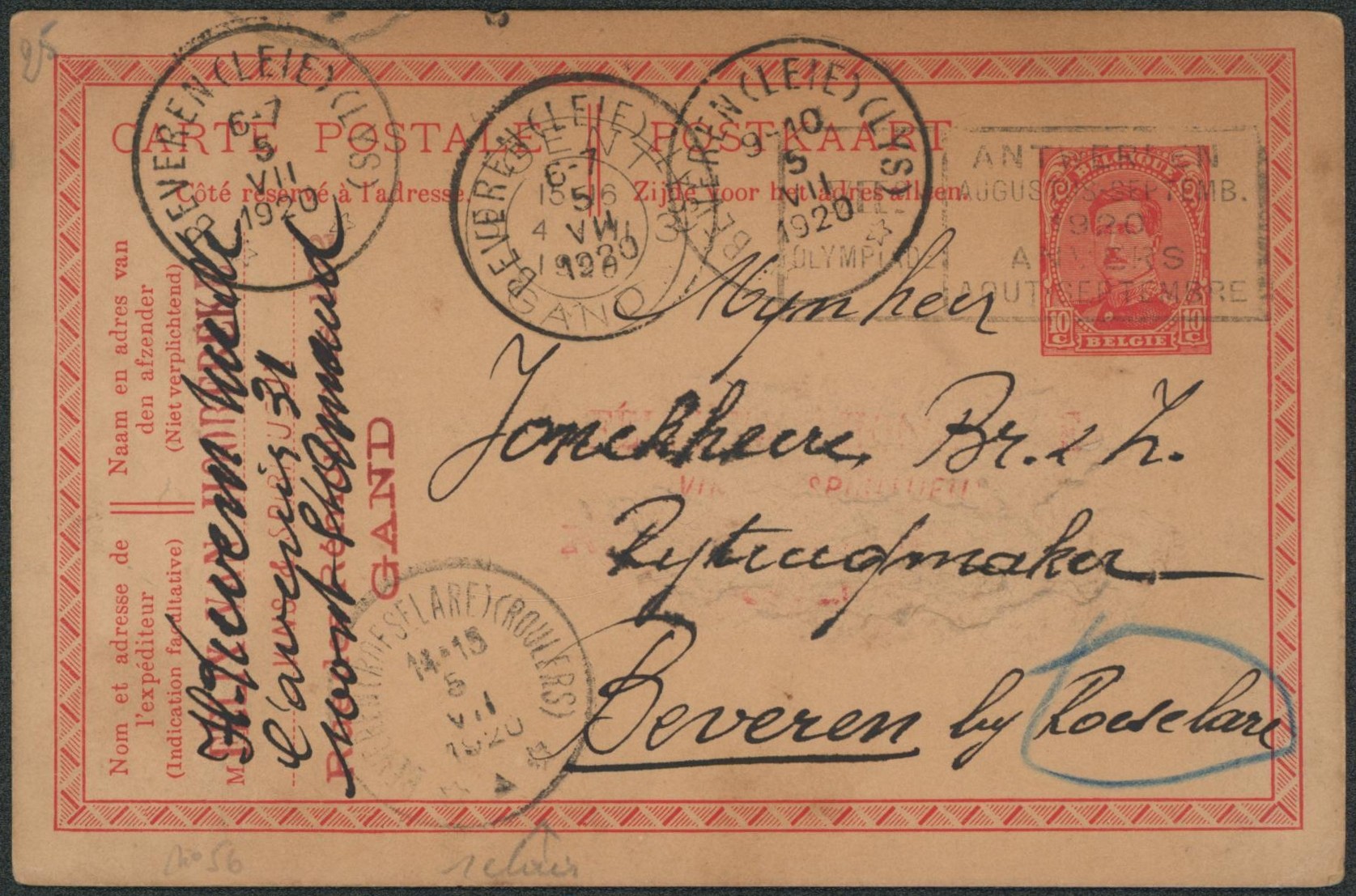 EP au type 10ctm rouge Albert I obl mécanique Gent / Gand 3 > Beveren bij Roeselare + double cachet relais çàd "Beiveren (Leie ) (Lys)" + arrivée "Beiveren (Roeselare) (Roulers)""