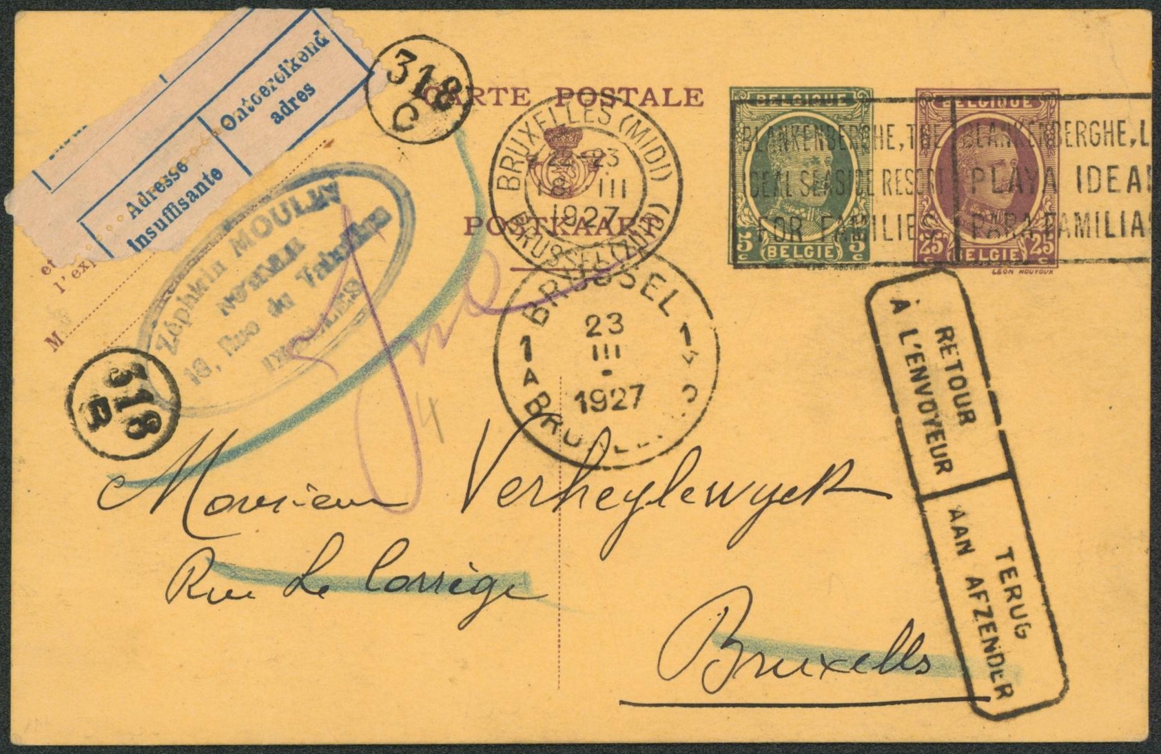 EP au type 25c + 5c houyoux expédié de Bruxelles (midi) > Bruxelles + étiquette bilingue "Adresse insufissante" et griffe encadrée "Retour à l'envoyeur""