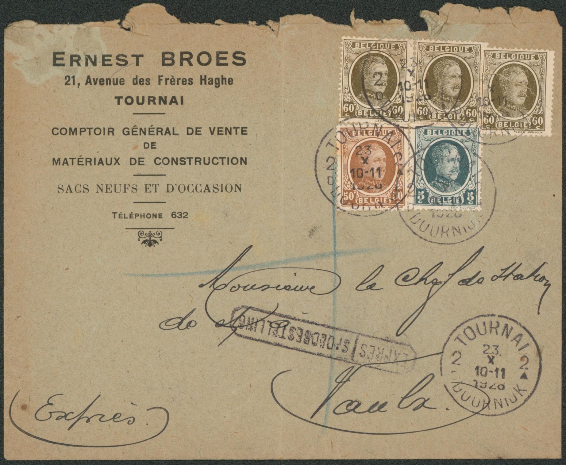 Houyoux - n°193, 203 et 255 x3 sur lettre en expres de Tournai > Vaulx çàd arrivée chemin de fer.