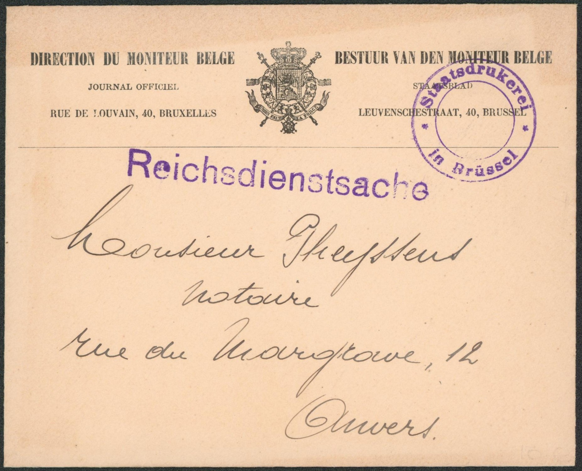 Lettre imprimée DORECTION DU MONITEUR BELGE / BESTUUR VAN DEN MONITEUR BELGE + cachet violet DC "Sttatsdrukeri / In brussel" > Anvers. "