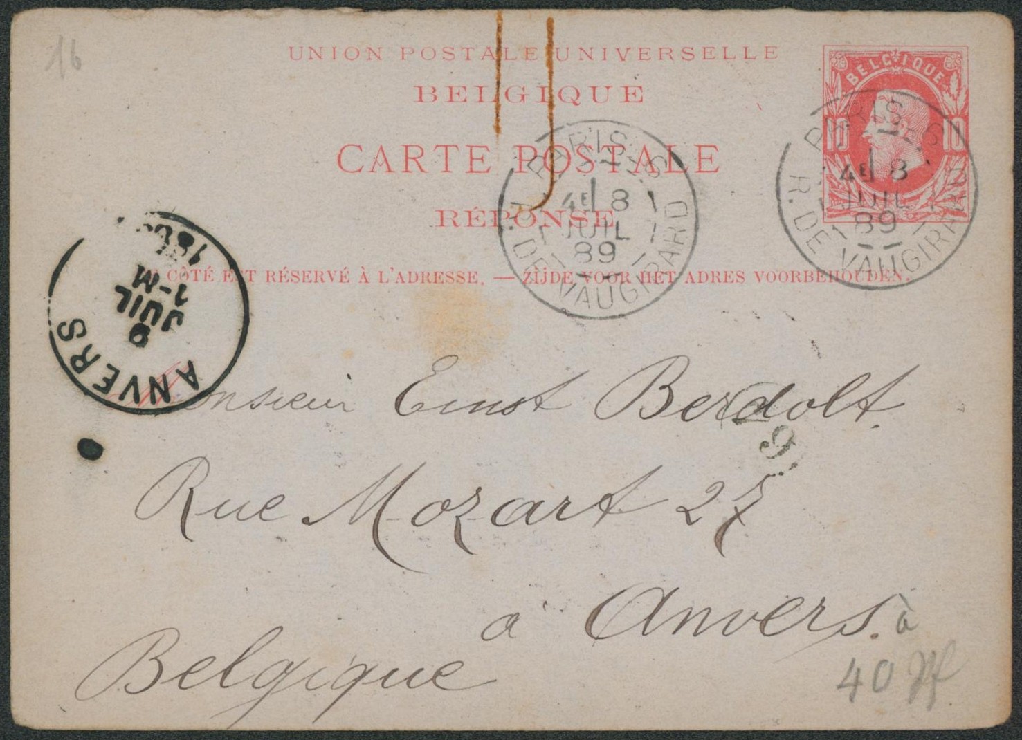 EP au type 10ctm rouge (SBEP n°16, réponse) de Paris 6 / R. De vaugirard > Anvers / Texte.