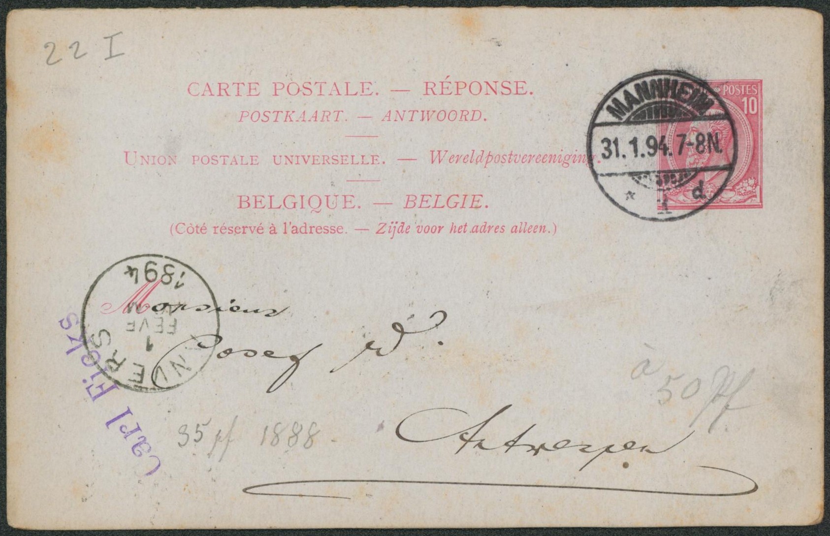 Ep au type 10ctm rose (SBEP n°22I, réponse) de Mannheim (Allemagne) > Antwerpen / Texte.
