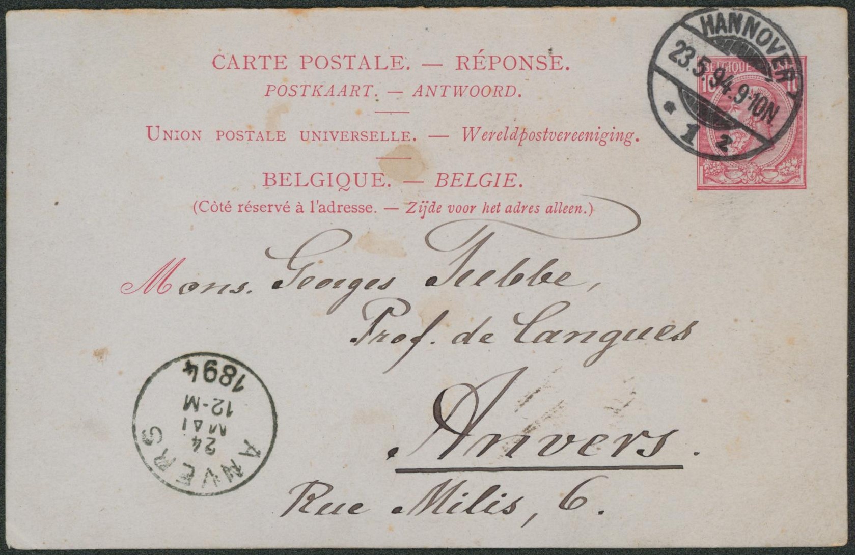 Ep au type 10ctm rose (SBEP n°22II, réponse) de Hannover (Allemagne) > Antwerpen / Texte.