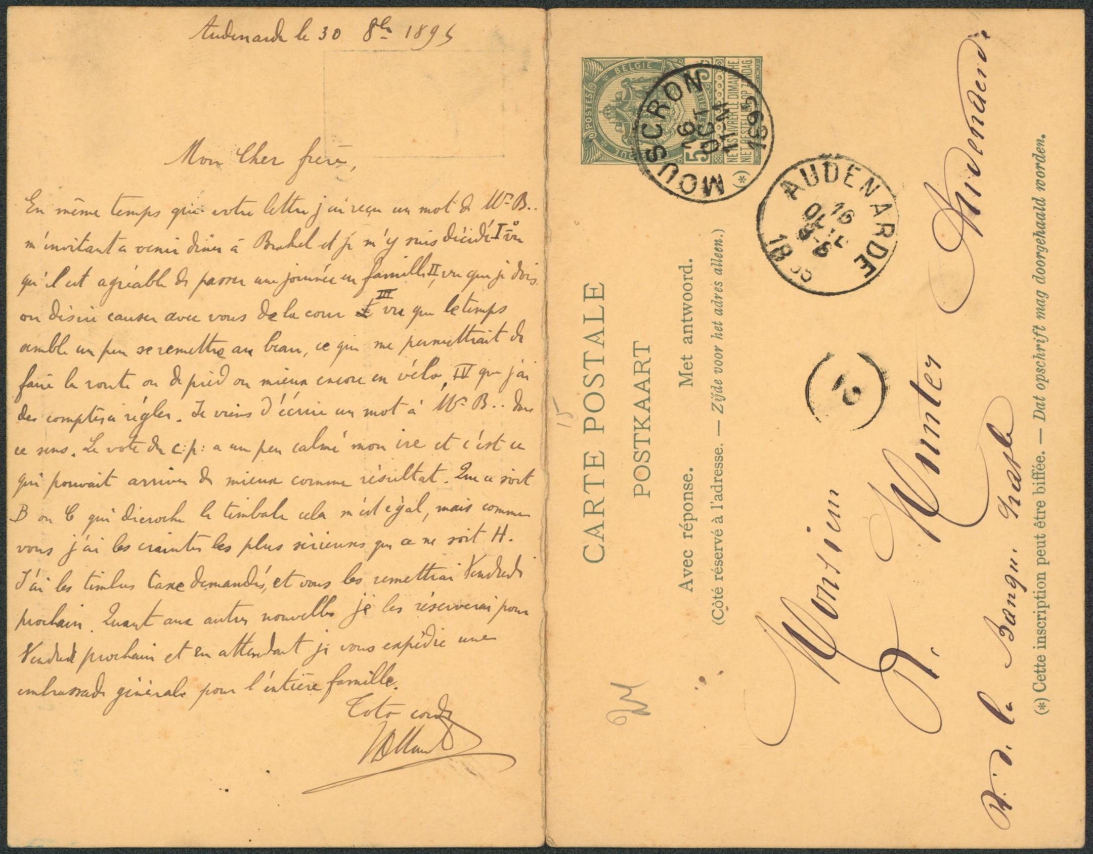 EP (double) au type 5ctm vert (SBPE n°24) expédié de Mouscron > Audenarde + réponse de Audenarde > Anvers.